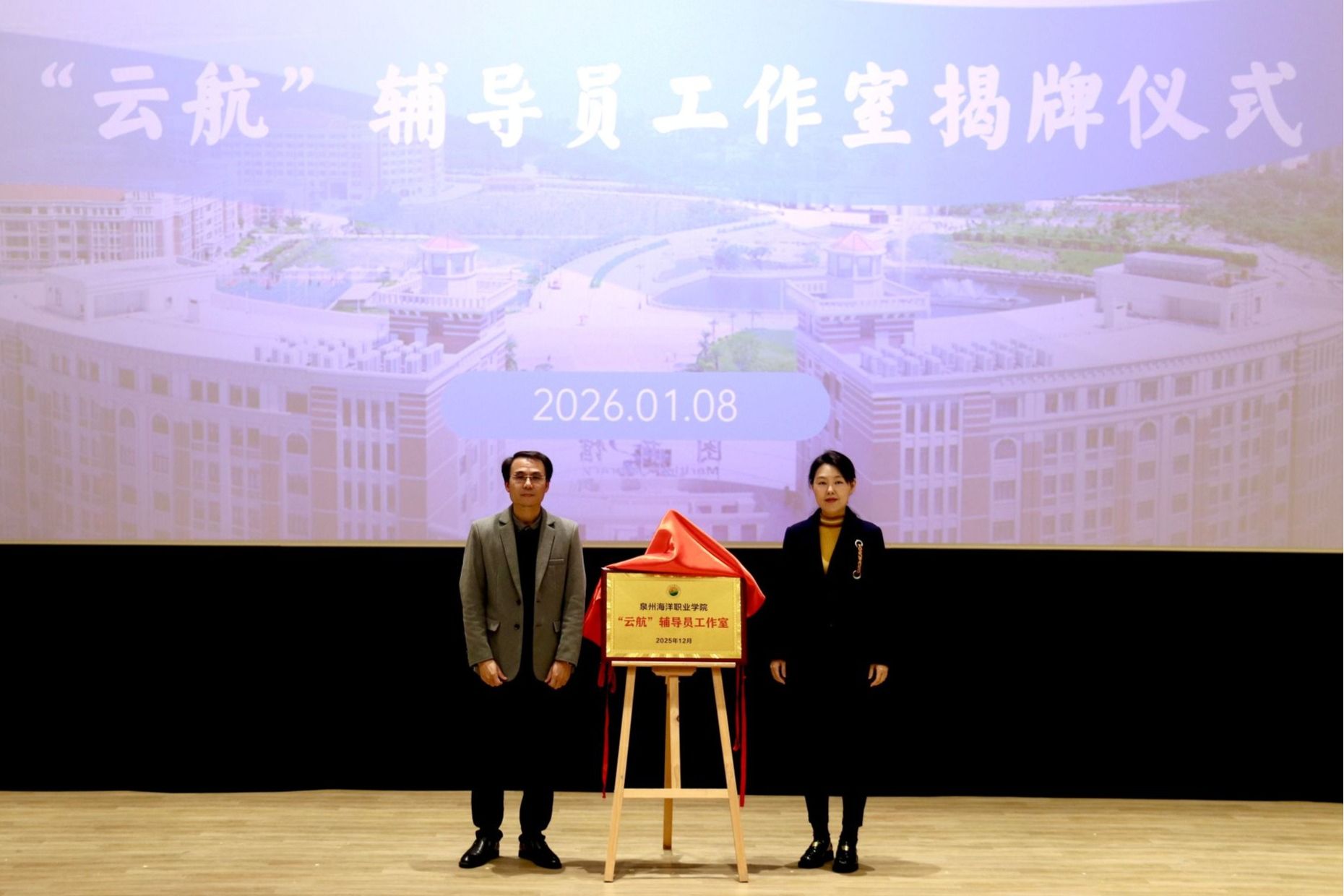 (新闻中心讯 党委学工部供稿 党委宣传部报道)为进一步加强思政育人工作,助力学生高质量就业,推动辅导员队伍专业化、职业化发展,1月8日,我校“云航”辅导员工作室、“远航”辅导员工作室成立仪式在图书馆报告厅举行。校党委书记黄真真,副校长陈永鑫,校党委副书记、副校长李明灿,以及党委学工部、党委宣传部、党委保卫部、校团委、对外合作处及二级学院相关负责人出席仪式,学工系统全体人员参加活动。仪式上,党委学生工作部部长张君宣读了关于成立两个辅导员工作室的文件。...