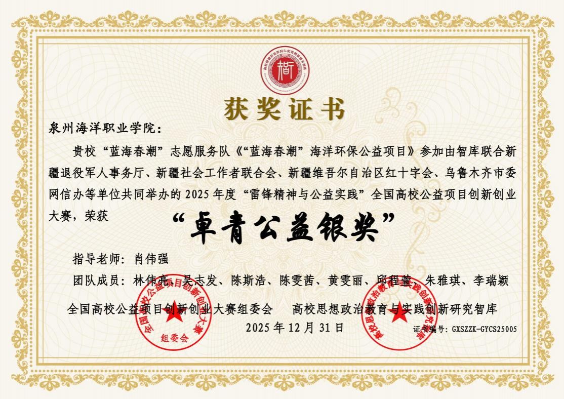 (新闻中心讯 校团委供稿 党委宣传部报道)近日,在2025年“雷锋精神与公益实践”全国高校公益项目创新创业大赛中,我校团委“蓝海春潮”志愿服务队表现突出,荣获“卓青公益银奖”与“创新潜力优秀奖”。该大赛以“传承雷锋精神·创益青年行动”为主题,旨在通过“培训+竞赛”的模式,推动高校公益项目孵化与成长,鼓励青年将公益理念与创新创业相结合。大赛由高校思想政治教育与实践创新研究智库联合多家单位共同举办,重点关注项目的设计科学性与实践社会效益。...