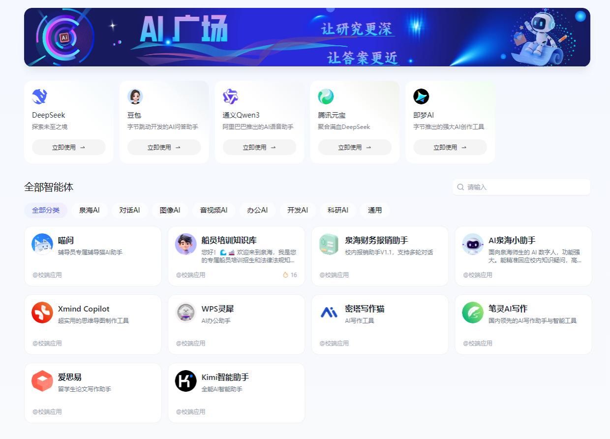 (新闻中心讯 数智化管理处供稿 党委宣传报道)近日,学校数智化管理处牵头打造的“AI广场”平台正式上线运行。该平台集移动端与PC端于一体,致力于为全校师生提供统一、便捷、安全的人工智能工具访问入口,标志着我校在教育数字化转型与智能化服务体系建设方面取得了又一实质性突破。“AI广场”平台坚持“自主创新与开放集成并重”的建设理念,构建两大核心板块:一是由学校数智化管理处基于校内知识沉淀,自主研发泉海AI系列智能体,...