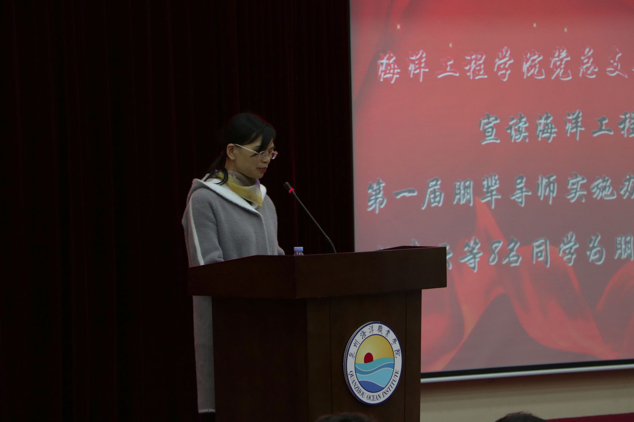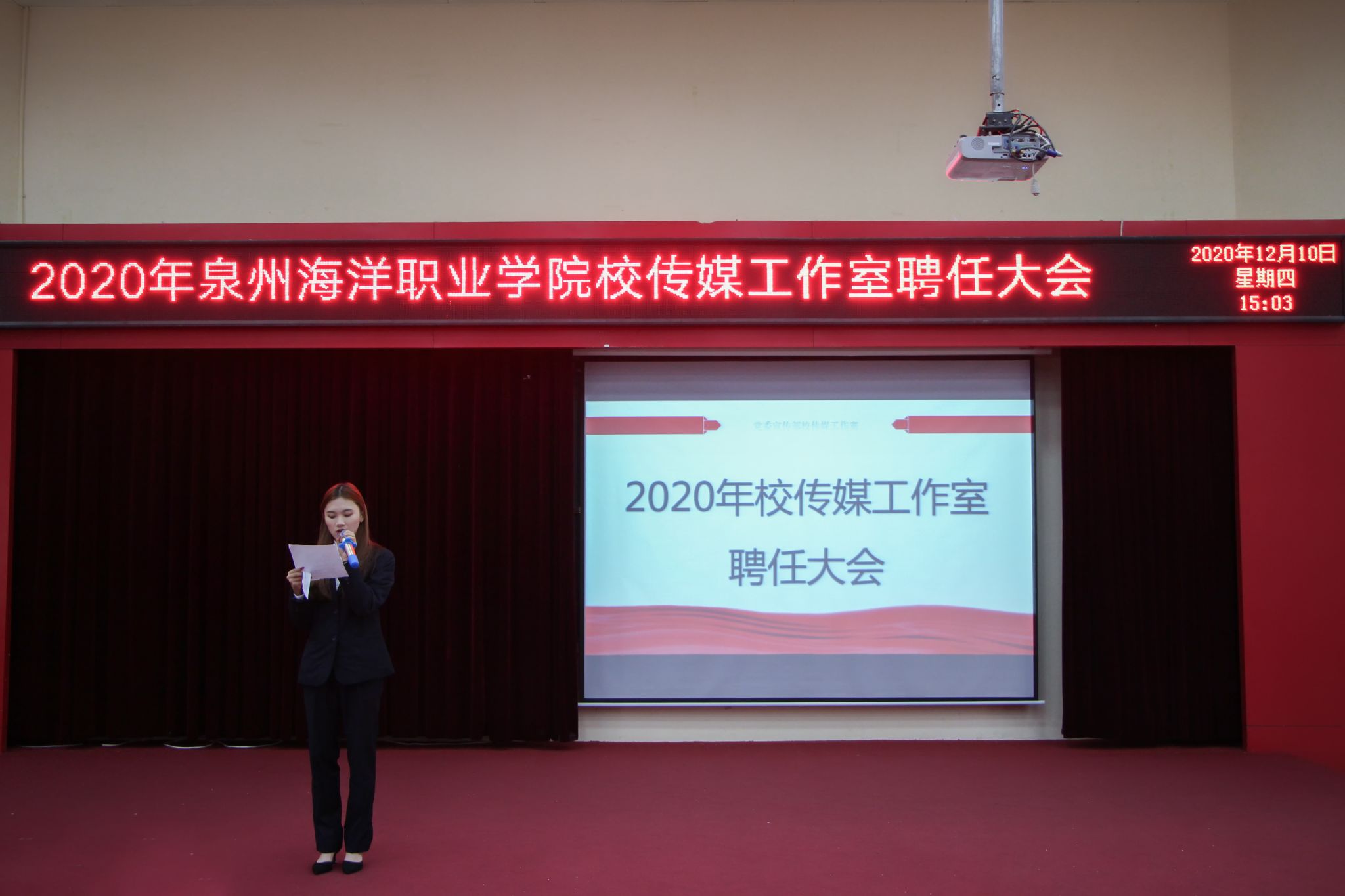 新闻中心讯(校传媒 高执供稿 党委宣传部报道)12月10日下午15:00,泉州海洋职业学院校传媒工作室聘任大会于2204报告厅顺利举行。党委副书记李明灿、党政办公室主任黄玲玲、社团指导老师黄小格、党务秘书阮玲玉老师及...
