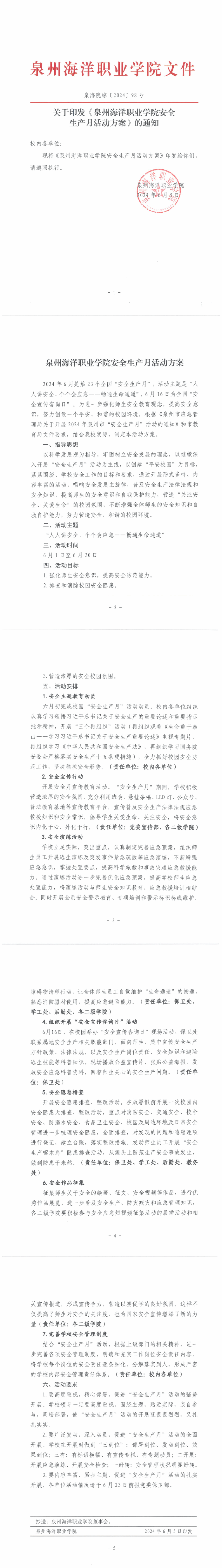 关于印发《泉州海洋职业学院安全生产月活动方案》的通知