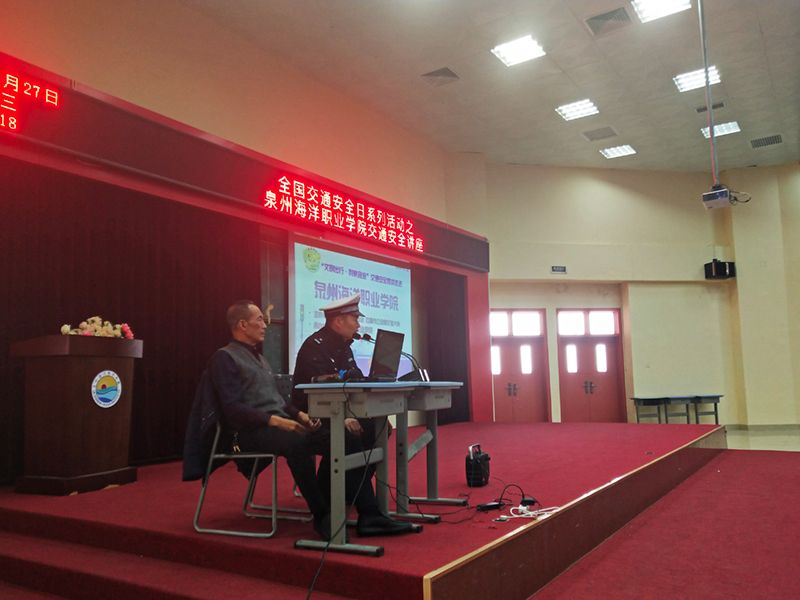 今年12月2日是我国第八个全国交通安全日,为进一步增强我校学生的交通安全意识,杜绝学生交通安全事故的发生。11月27日,我校安保中心诚邀石狮市交警十二中队施养杭中队长、原交警大队交管股长蔡科日讲师共同进校为我校学生开展交通安全知识讲座。