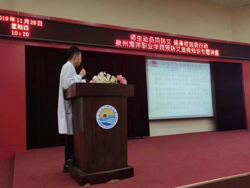 随着世界艾滋病宣传日即将来临,为普及和宣传艾滋病预防常识,提高我校学生对艾滋病的认识,加强对艾滋病的预防及管控,我校安保中心诚邀祥芝镇卫生院,于11月28日当天上午在2204报告厅为我校大一新生开展艾滋病预防知识专题宣讲。