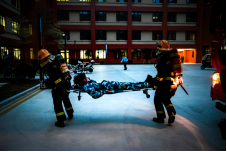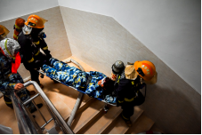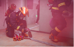 与此同时,鸿山消防中队接到“报警”后迅速抵达现场。宿舍楼“火势”蔓延,浓烟覆盖了逃生通道,15203宿舍内有两名学生被困于浓烟中无法逃生,鸿山消防中队迅速出动人员进行营救,其中救援人员用担架协助一名伤员安全撤离,另一名同学在救援人员的指导下佩戴防毒面具安全撤离。另一边消防员们熟练连接水带、架设水枪,对准“火点”精准喷射,一系列专业操作一气呵成,成功在短时间内“扑灭”火情。让在场师生直观感受到专业救援的速度与力量。