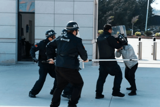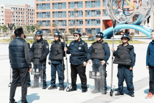 演练中,按照既定方案,随着演练总指挥一声指令,反恐应急演练正式启动。一名“歹徒”手持仿真刀具,以非法闯入校园意图行凶伤人为目的,在学校南大门处强行翻越闸门。我校南大门值守保安员发现情况后,第一时间作出反应,立即上前进行劝阻,另一名值守副班保安员同时迅速启动应急机制,用对讲机快速呼叫各安防岗位力量紧急支援,同时使用校园“一键报警”系统同步报警。接到支援呼叫后,校警务室辅警队、各安防岗位人员立即穿戴好防暴装备,携带防暴盾牌、钢叉、约束带等器械,迅速赶赴现场,按照既定战术配合,沉着与“歹徒”周旋,逐步缩小围控范围,有效牵制其行动。110指挥中心接到学校报警后,立即指派祥芝派出所民警赶赴现场进行处置。在学校安防人员和祥芝派出所民警专业处置和默契配合下,迅速控制“歹徒”肢体,夺下其手中仿真刀具,用约束带将“歹徒”规范约束,随后将其带离现场,整个处置过程紧张有序、高效规范。
