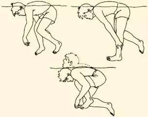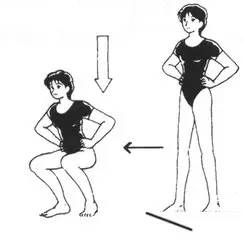 下蹲弯腰:两脚平肩站立,两手向前平胸伸直,下蹲站起,数数呼吸,下蹲吸气,站起呼气,共50次;之后双手转为向左右平伸,再下蹲站起,数数呼吸,方法如前,也做50次,站起时上身稍微后倾顶腹,绷紧肚皮;接着勾头弯腰成弓形。将腰似鸡啄米一般一躬一躬地向下弯,下弯时两手向下伸直,指尖尽量贴近脚面或地面,同时数数呼吸,向下吸气,往上呼气,共100次。