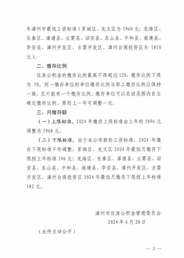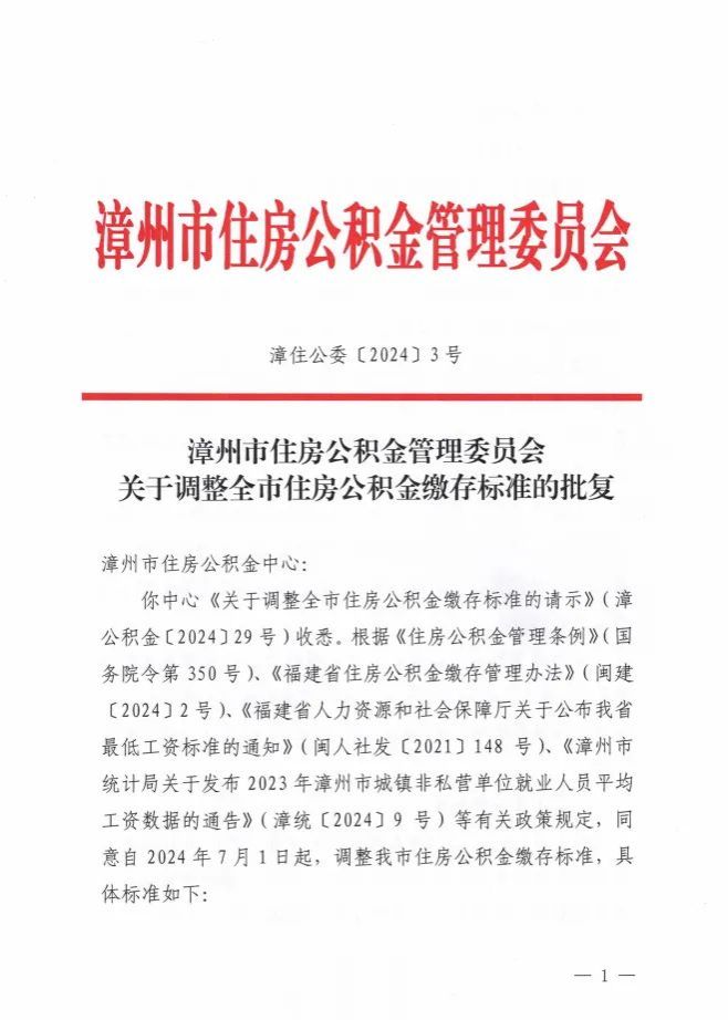 6月28日,漳州市住房公积金管理委员会发布《关于调整全市住房公积金缴存标准的批复》,明确自2024年7月1日起,全市将执行新的住房公积金缴存标准,月缴存额上限由上年5896元调整为5968元。