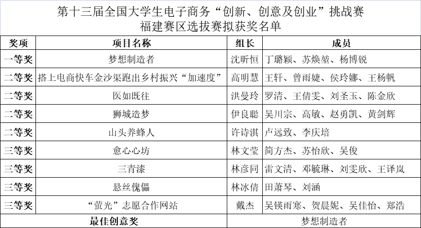 2023年5月27日,第十三届全国大学生电子商务“创新、创意及创业”挑战赛福建省选拔赛在闽江学院拉开序幕。我校共15组创业项目入围省赛比赛,其中5组创业项目在黄金帅老师、肖伟强老师带队下参加现场比赛,10组创业项目通过线上参赛。省赛通过激烈的2天比拼,最终在此次省赛中再创佳绩,取得了一等奖1项、二等奖4项、三等奖4项和最佳创新奖1项,同时吴云东老师、郑天明老师获评省赛优秀指导老师奖。