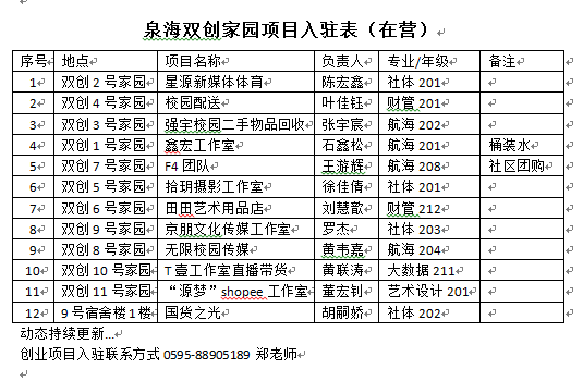泉海双创家园项目入驻表(在营)
