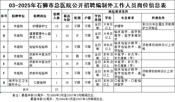 3.报名材料:身份证、毕业证、学位证、资格证书(以上均需提供原件及复印件);1寸彩照、《石狮市总医院编外人员招聘报名登记表》(填写报名表时报名表上的岗位代码请填写岗位对应的英文字母,岗位名称请填写“某某单位某某岗位”)等。