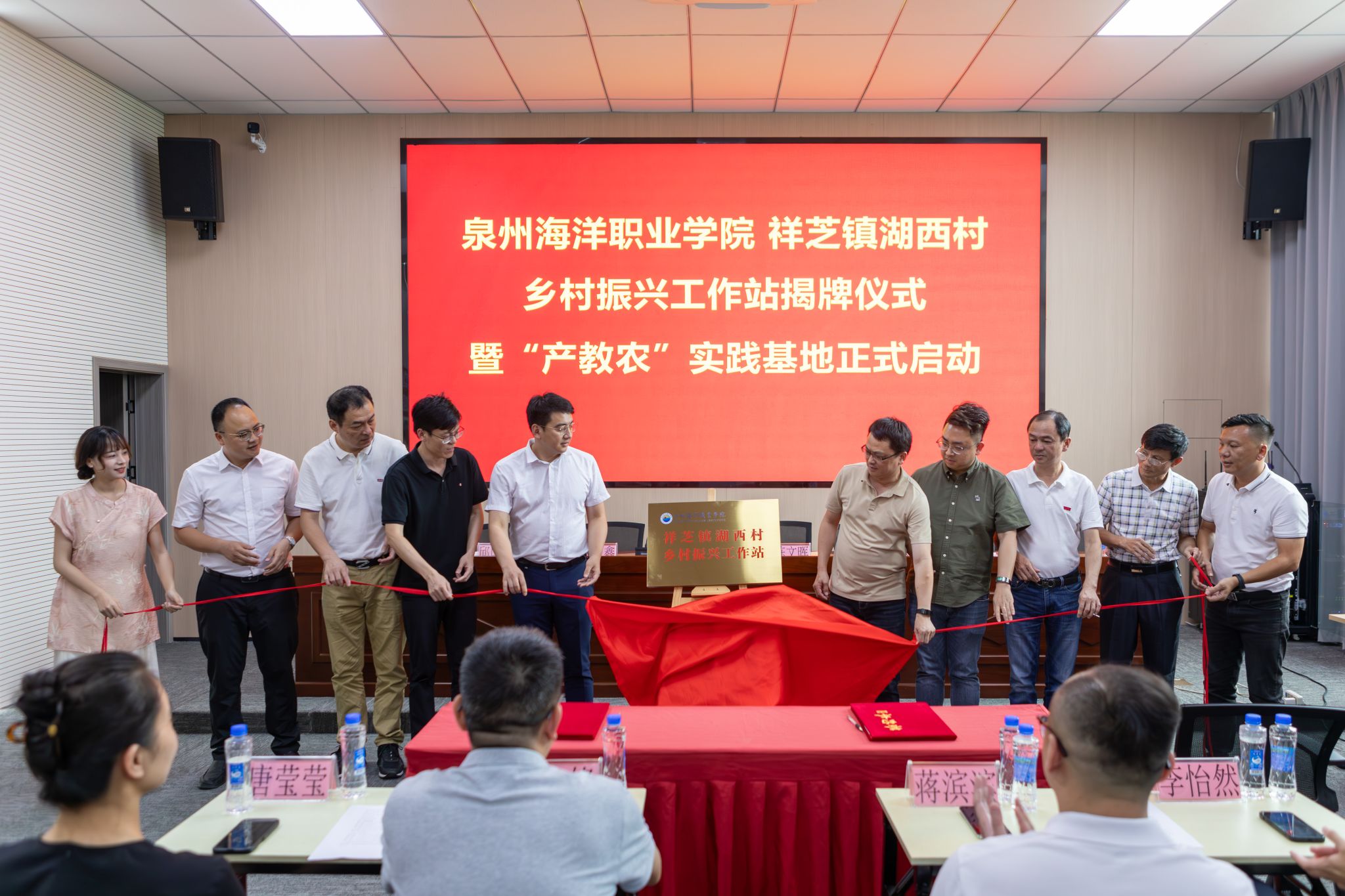 在热烈的掌声中,校地领导共同为“泉州海洋职业学院祥芝镇湖西村乡村振兴工作站”揭牌,并宣布“产教农”实践基地正式启动!