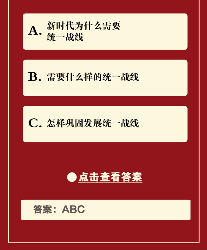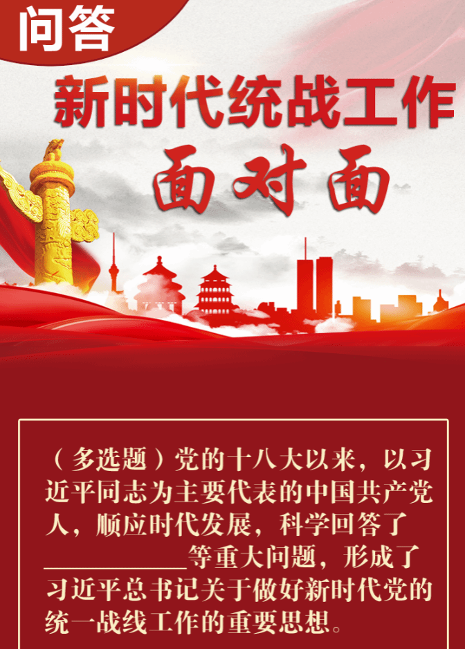 按:坚持统一战线是中国共产党百年奋斗的一条重要历史经验。毛泽东同志指出,统一战线是一门专门科学。习近平总书记强调,我们搞统一战线,从来不是为了好看、为了好听,而是因为有用、有大用、有不可或缺的作用。为帮助广大党政干部、统战干部、统一战线成员深入学习贯彻习近平总书记关于做好新时代党的统一战线工作的重要思想,学好用好统一战线这一重要法宝,“统战新语”推出“问答·新时代统战工作面对面”答题活动,围绕统一战线的基础理论政策进行问答解析,请诸君打卡挑战,你能答对吗?