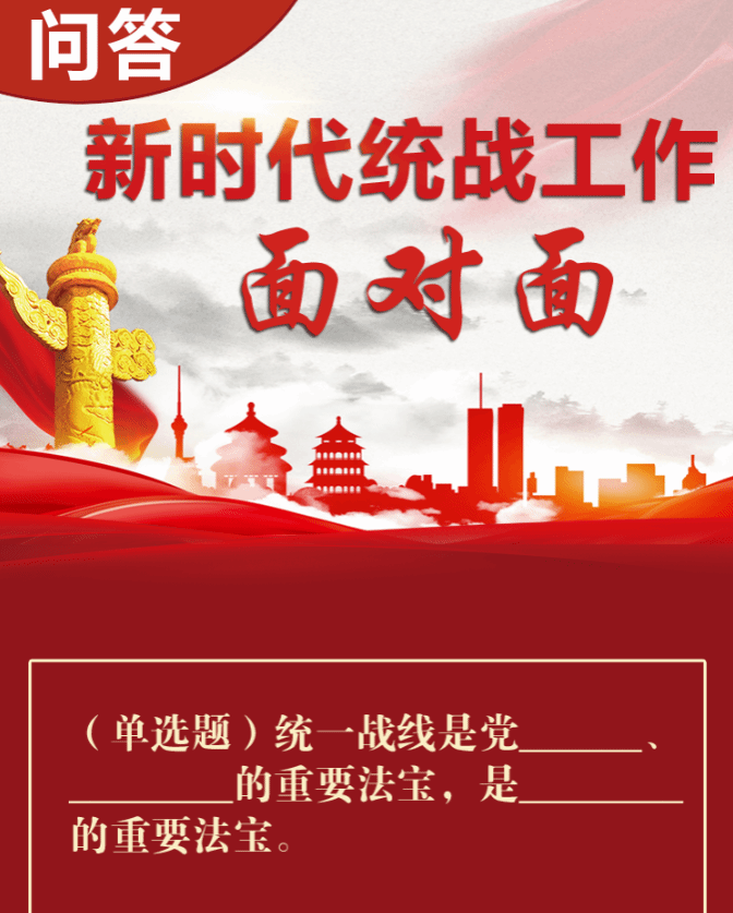按:坚持统一战线是中国共产党百年奋斗的一条重要历史经验。毛泽东同志指出,统一战线是一门专门科学。习近平总书记强调,我们搞统一战线,从来不是为了好看、为了好听,而是因为有用、有大用、有不可或缺的作用。为帮助广大党政干部、统战干部、统一战线成员深入学习贯彻习近平总书记关于做好新时代党的统一战线工作的重要思想,学好用好统一战线这一重要法宝,“统战新语”推出“问答·新时代统战工作面对面”答题活动,围绕统一战线的基础理论政策进行问答解析,请诸君打卡挑战,你能答对吗?