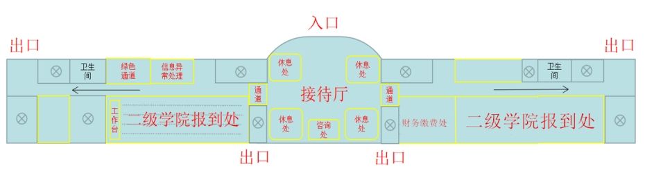 ①入校后经引导,了解是否已完成缴费及预选宿舍,如果已完成,引导到快捷报到点,未完成缴费的引导至达报到大厅