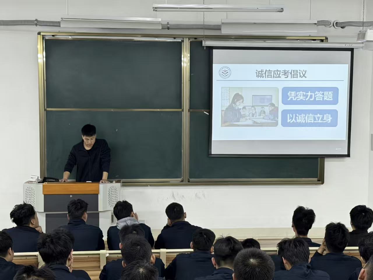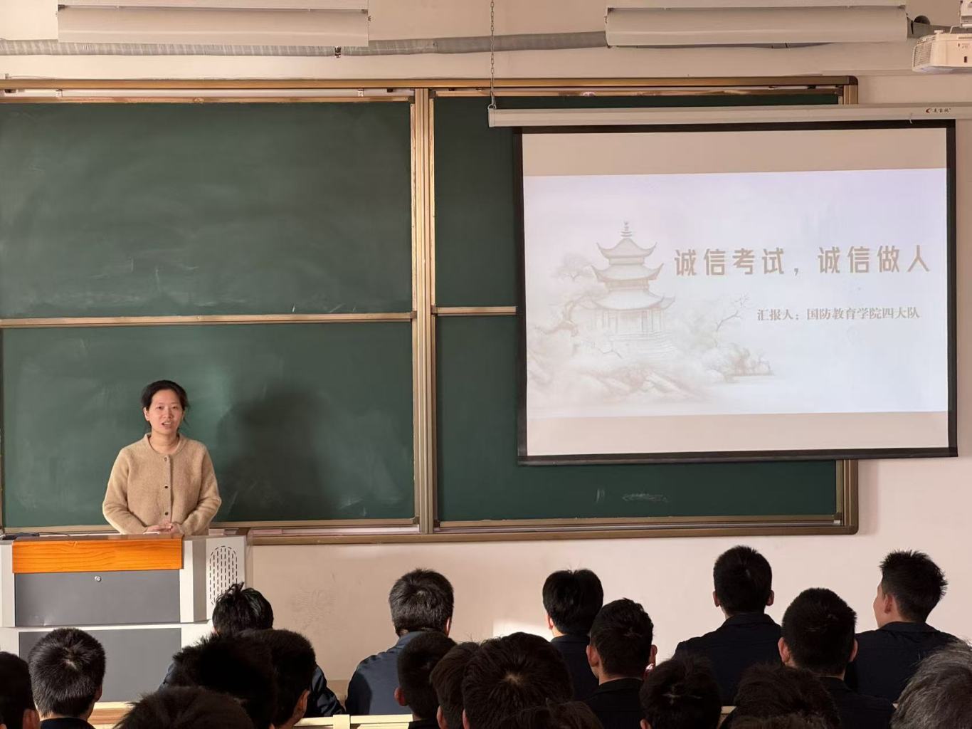 班会现场,各大队辅导员结合校、院两级育人特色,通过PPT演示、典型案例剖析、校规解读等形式,向同学们系统讲解考试作弊的具体情形、纪律处分措施以及诚信考试的深刻内涵。从携带通讯工具作弊、协同作弊,到替考代考等严重违纪行为,辅导员逐一梳理违规情形,并结合学校学生管理规定要求,明确作弊行为将面临的记过、留校察看甚至开除学籍等严重后果,让同学们深刻认识到:考试作弊不仅违背诚信原则,更是对国防学子素养与纪律意识的背离,会对个人成长与学业发展造成不可逆的负面影响。