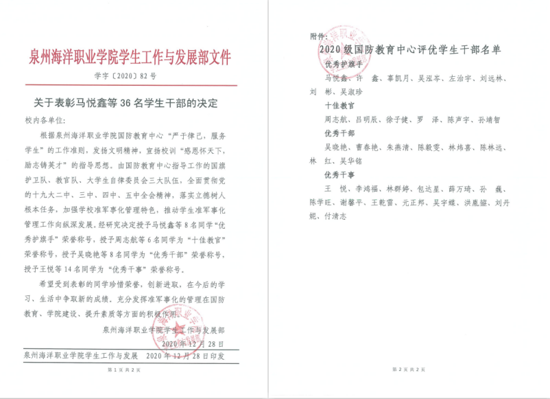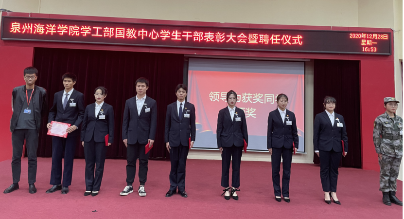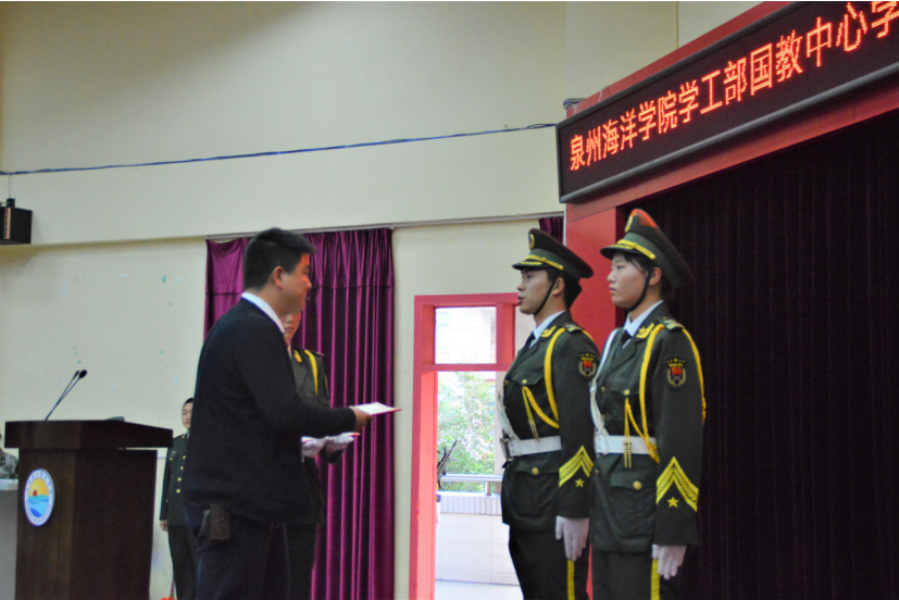 2020年12月28日下午,泉州海洋职业学院国防教育中心表彰大会暨国旗护卫队聘任仪式在2204报告厅举行。出席本次大会的有学生工作与发展部部长苏良城老师、副部长张婉薇老师、创新创业与就业中心主任黄海滨老师、安保中心副主任郭晓军老师、国防教育基地军事训练教官陈成林老师,以及各二级学院辅导员老师们。大会由国防教育中心副主任贺充老师主持。