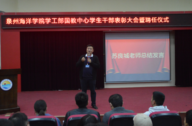 最后,学生工作与发展部部长苏良城老师在总结中对本次受到表彰的同学给予了充分的肯定,向大家阐述了三支队伍的历史,工作的辛苦,但是大家的工作还没有结束,还有一片崭新的舞台让大家发挥。希望大家以受表彰同学为榜样,向他们学习,常怀感恩、不负韶华、甘于奉献,争做心中有祖国、心中有泉海、心中有责任的时代新人,把个人理想追求融入国家和学校的事业之中,为国家和学校作出自己的贡献。