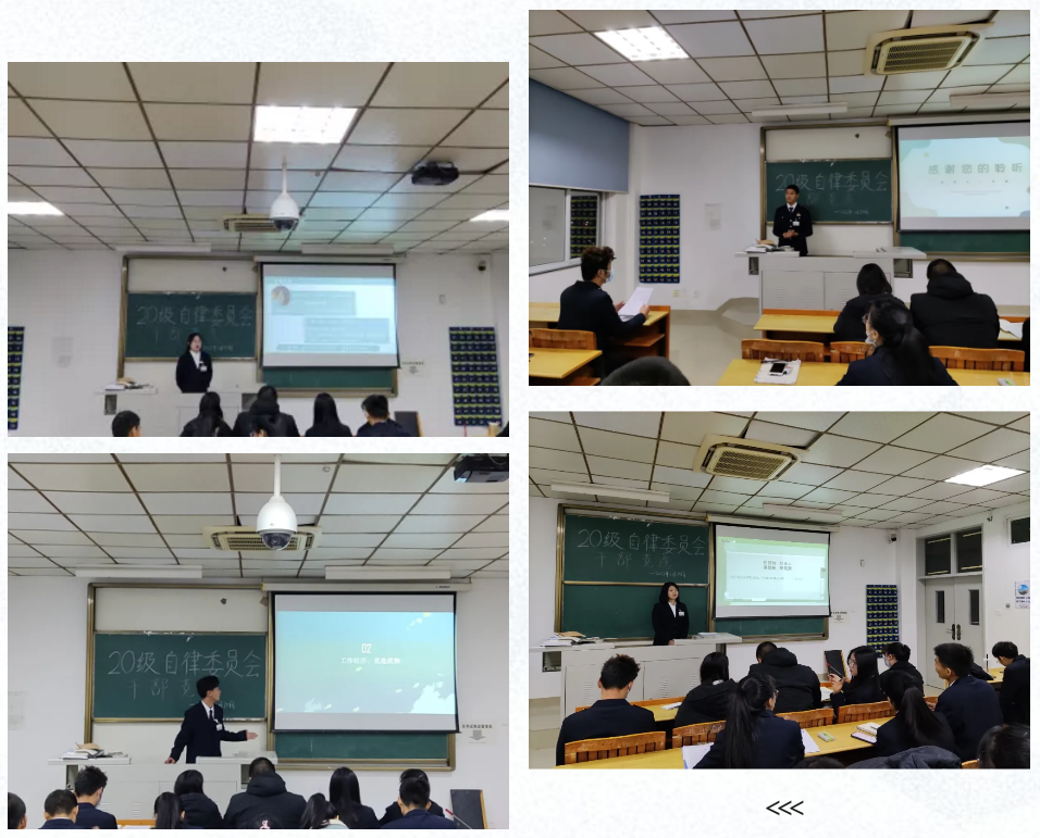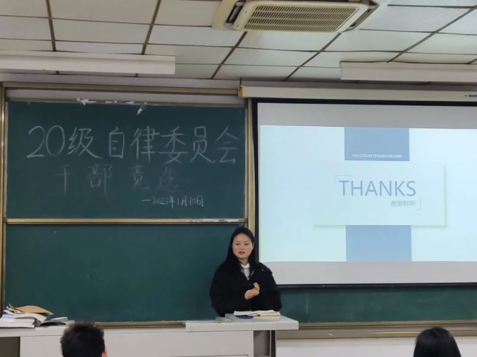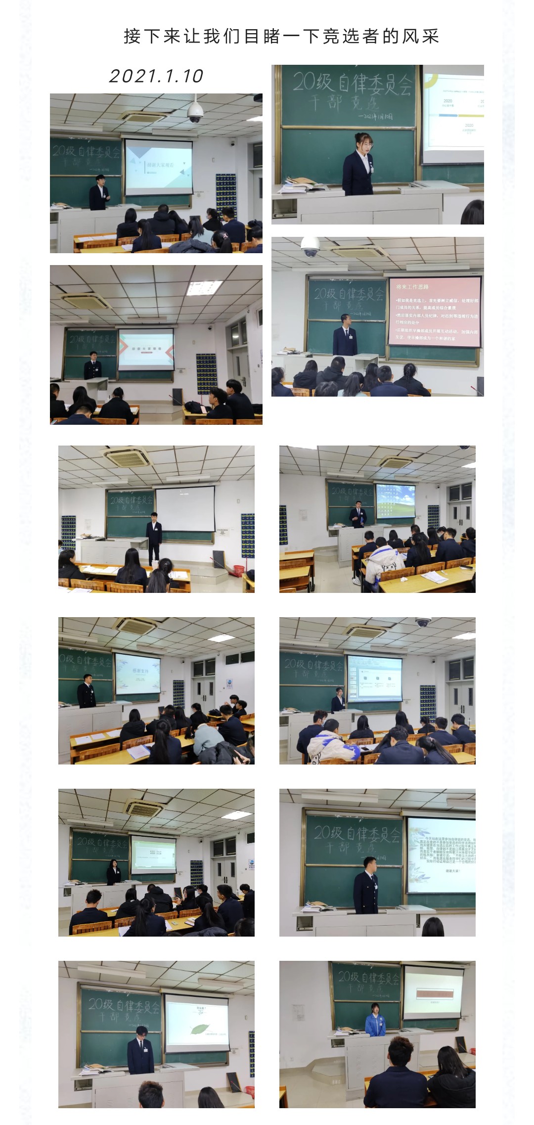 告别2020,迎来2021,2021年1月10日19:00自律委员会在2401举行一年一度的干部竞选,出席本次竞选大会的老师有国防教育中心副主任贺充老师、自律委员会指导老师郑秋香老师,担任本次大会的评委有19级自律委员会干部。