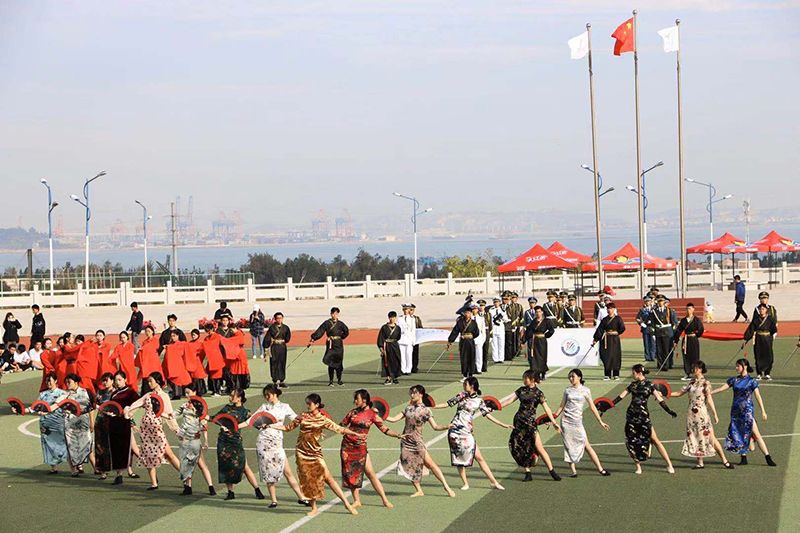 梁松刚书记为开幕式致辞,他对本届运动会的顺利召开表示热烈的祝贺,并向为筹备本次运动会付出辛勤努力的教职工及同学们表示衷心的感谢。紧接着,周晓恩同学代表运动员宣誓,承诺全体运动员将全力以赴、公平竞赛,为全体师生献上一场青春的 “昂扬进行曲”;随后赵源老师代表裁判员宣誓,他表示全体裁判员将秉持公正、公平、公开原则执裁此次运动会,为全体参赛选手提供公平公正的竞赛平台。裁判员及运动员退场后,由各学院带来精彩的方阵队演出,航海物流学院带来的《旗开得胜》与经济管理学院带来的《武动钱坤》用整齐划一的动作赢得了在场观众的阵阵掌声。紧接着是本次运动会开幕式最大的亮点之一——由休闲文旅学院带来的《中华韵》表演。富有中国传统文化内涵的表演节目令人叹为观止,他们用标准的动作和整齐的舞姿展现了和谐之美与学子们青春向上的精神风貌。社体专业跆拳道表演、通识教育学院《军中姐妹》表演和家事护理学院《啦啦操》表演展现青春的活力,洋溢激情青春,掌声呐喊声在场内此起彼伏。