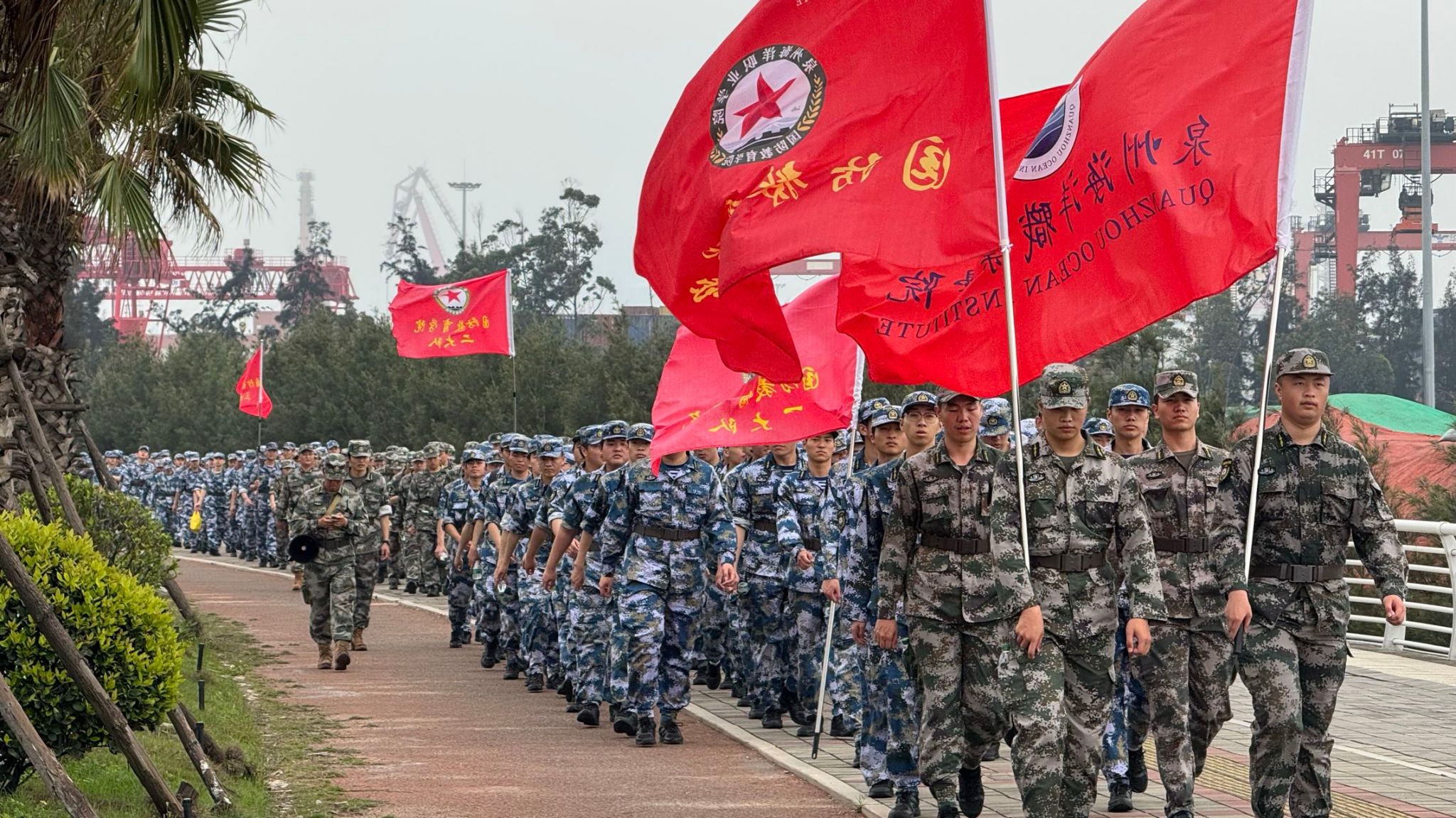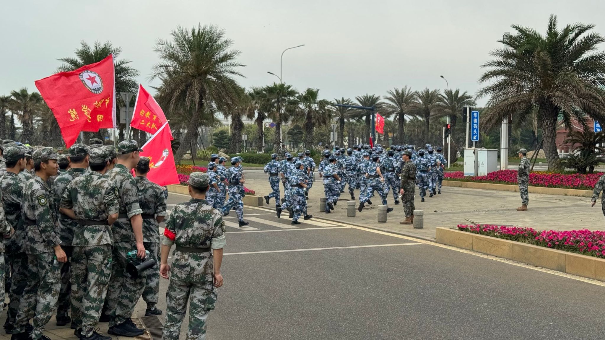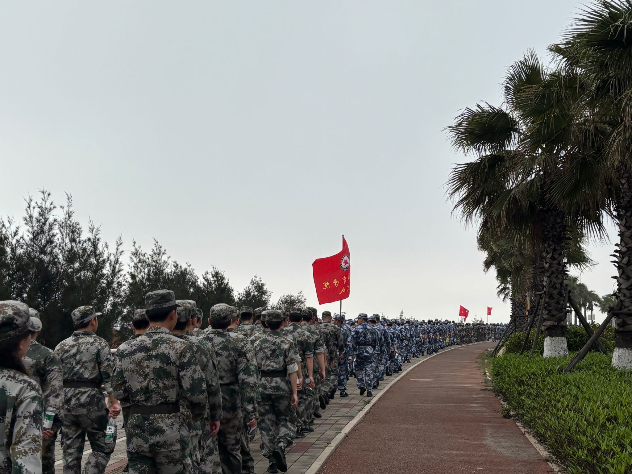 队伍成两路纵队沿预定路线行进,红旗在队首迎风招展。“一二三四”的呼号声此起彼伏,各大队轮流领唱《强军战歌》《团结就是力量》等军旅歌曲,节奏稳定、气氛热烈。行军途中,个别学员出现低血糖、中暑等身体不适,随队医疗保障人员迅速处置,经短暂休整后均顺利归队。全程无一人掉队,行进秩序始终严整。