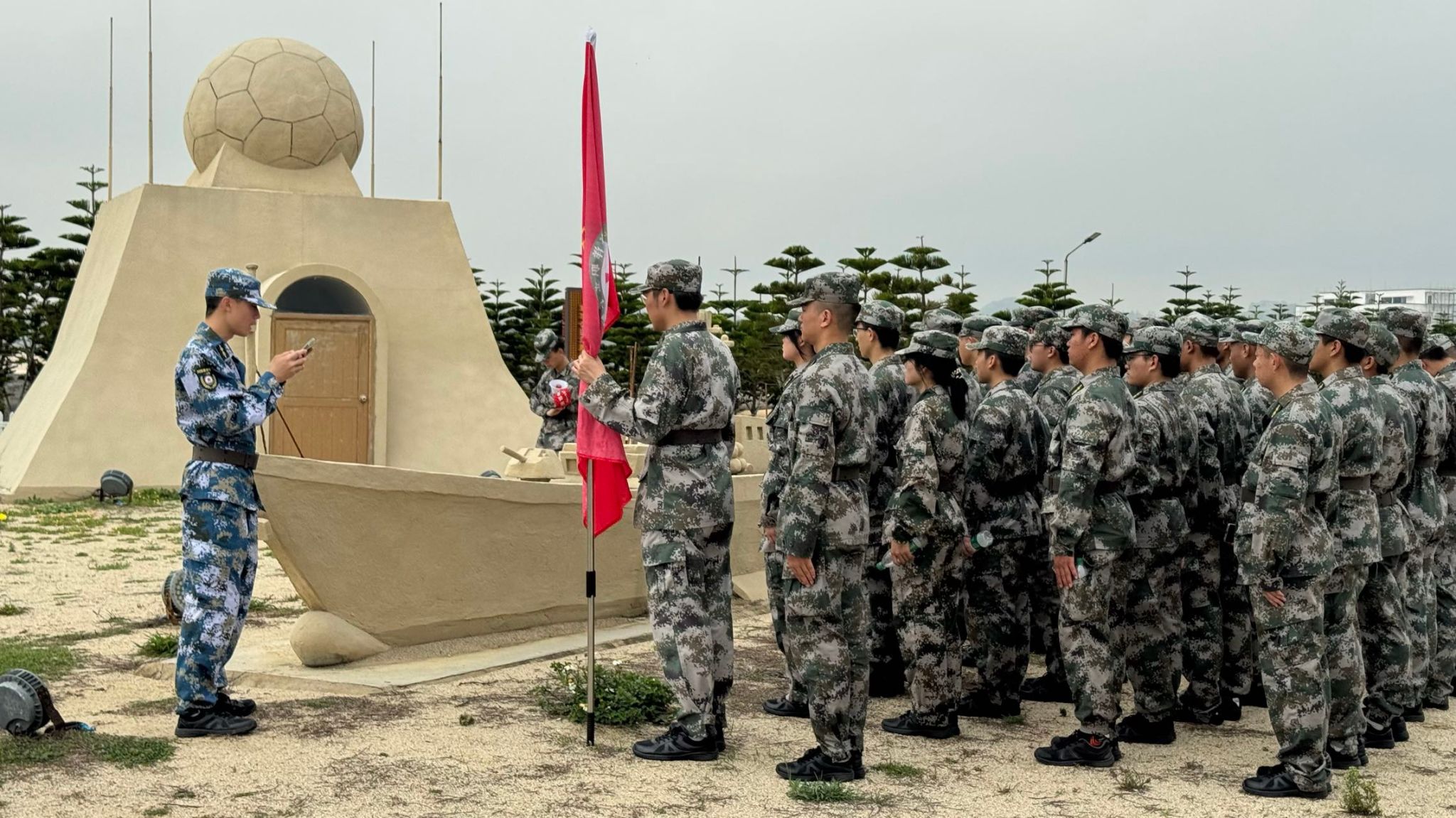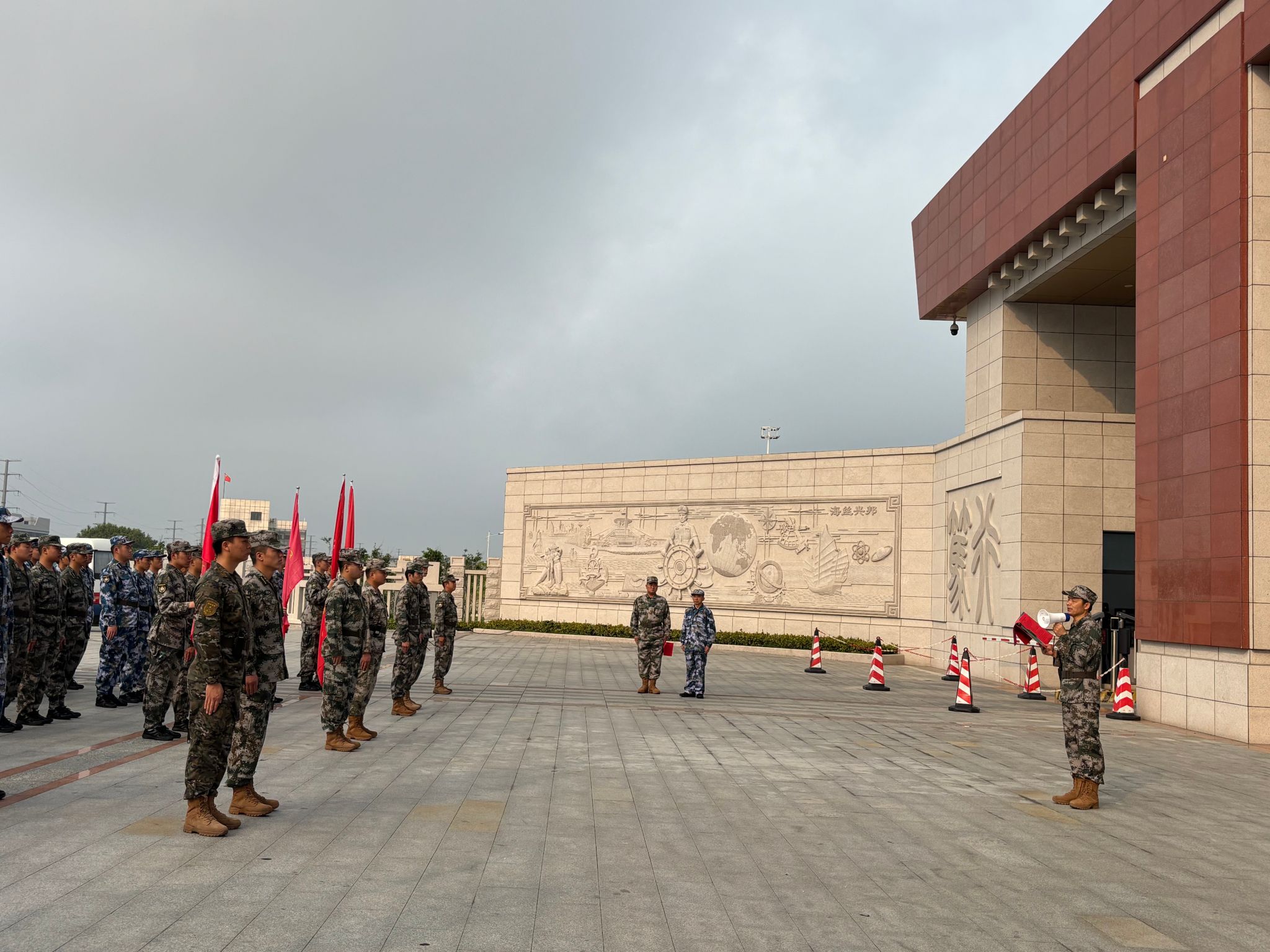 队伍按计划抵达军事公园集结地域。讲解员依托福建军舰沙塑模型,介绍了相关海防历史与舰艇知识,同学们列队聆听,神情专注。