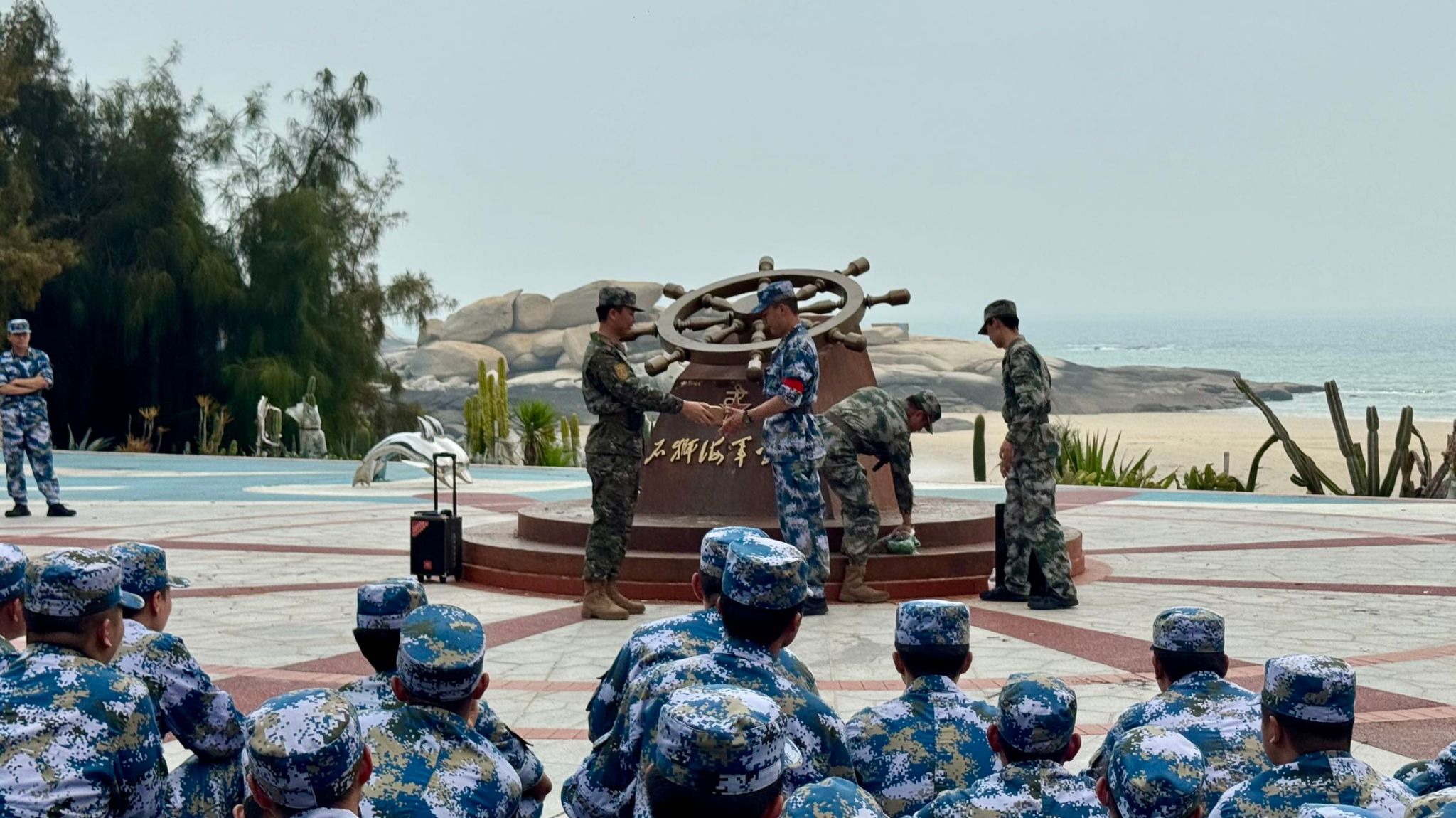 歌舞表演结束后,全体人员肃立,奏唱中华人民共和国国歌。雄壮的旋律在海天之间响起,每一个人神情庄重,歌声整齐有力。奏唱完毕,全体学员面向团旗整队肃立,举行重温入团誓词仪式。领誓人走到队列前方,右手握拳举起,全体学员随之高举右拳,字句铿锵,每一张年轻的面孔上都写满庄重。