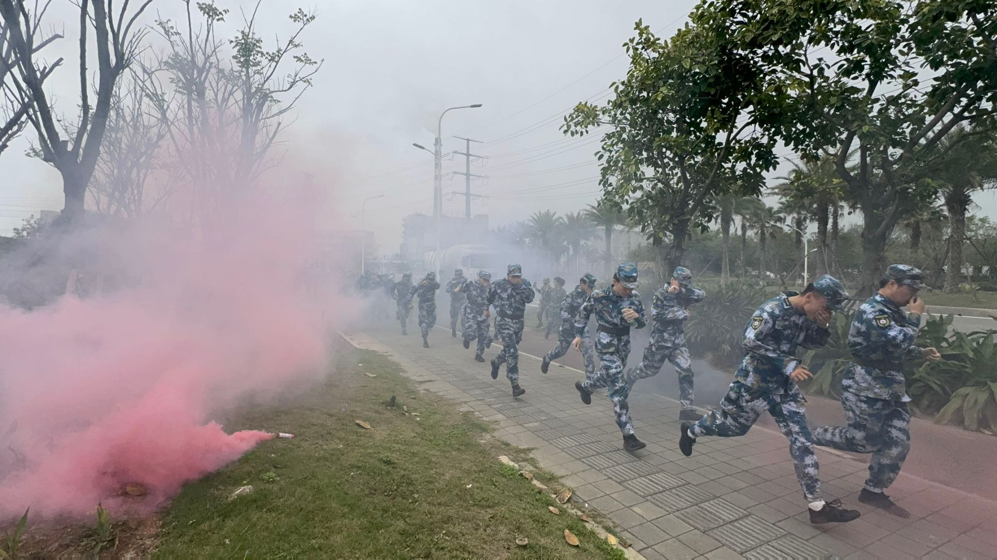 行至中途预设演练路段,橙色烟雾在地面燃起。“前方染毒地带,迅速防护通过!”指挥员口令下达后,全体学员动作统一,以衣袖捂住口鼻,压低重心,沿烟雾侧翼快速有序通过。从发现情况到全员安全穿越,过程衔接紧密,展现了日常防护训练的扎实成效。