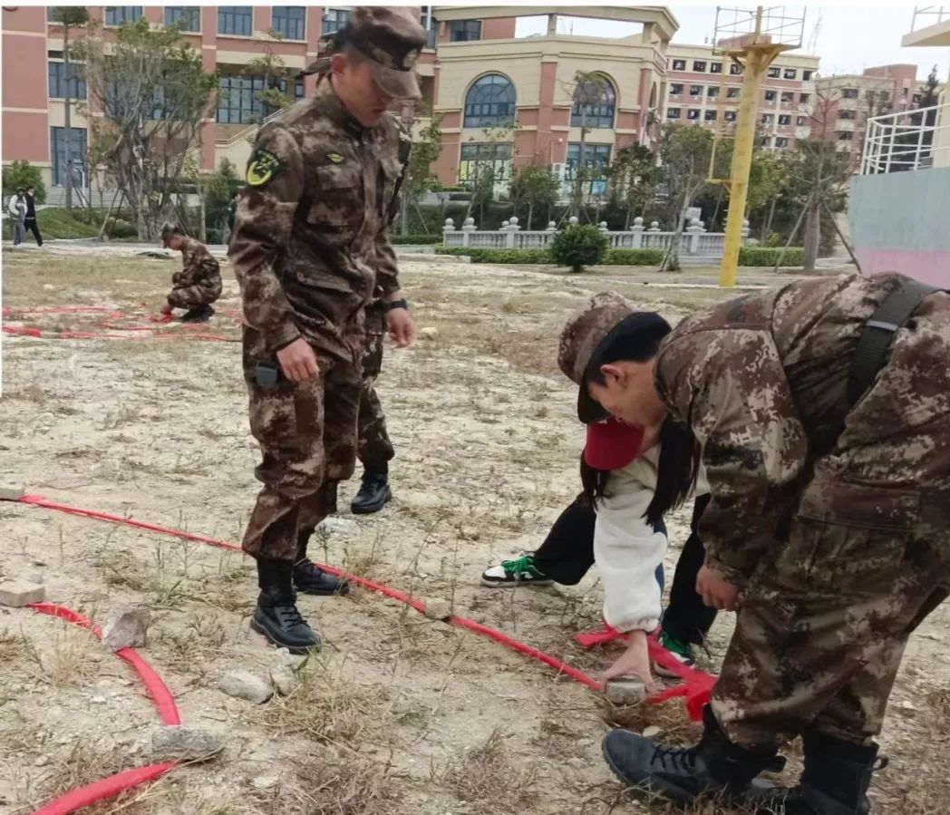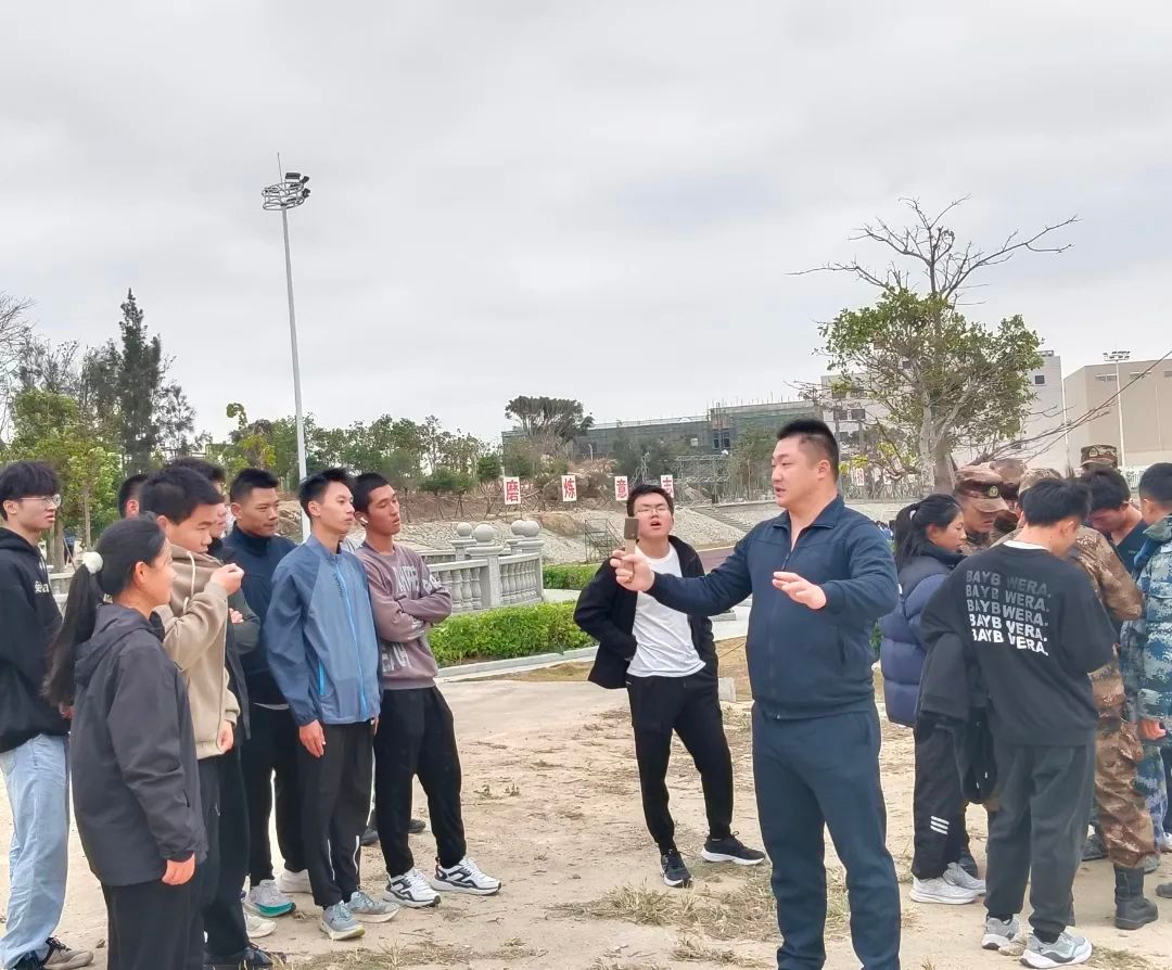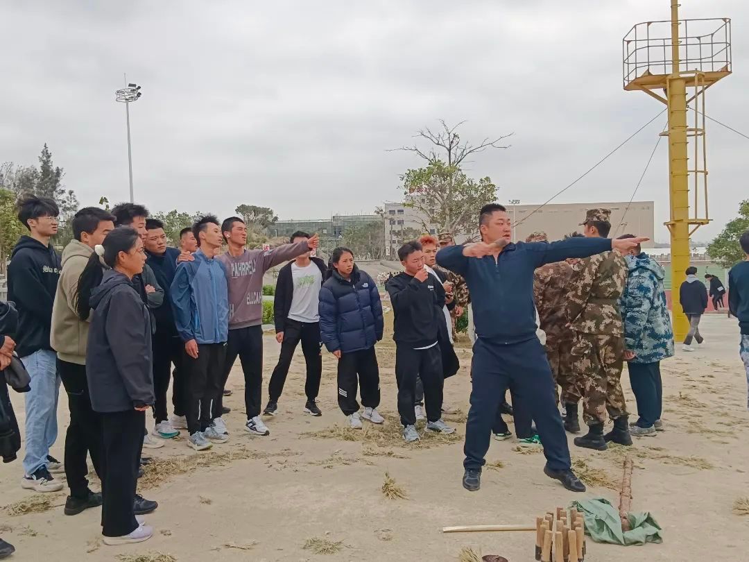 在最后的手榴弹投掷模拟开始前,国防教育学院党支部副书记贺充对参与学员进行手榴弹投掷技巧教学。国防教育学院二大队教官林建航与保障人员进行场地的布置和防护工作。