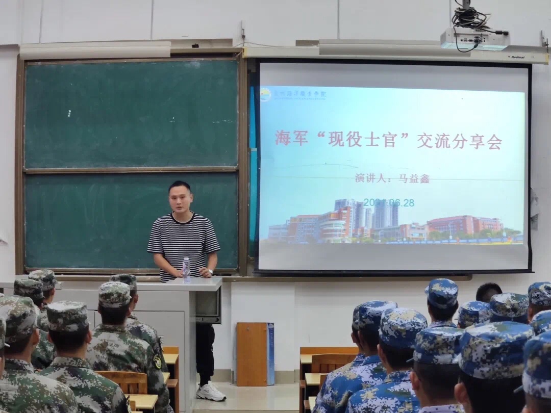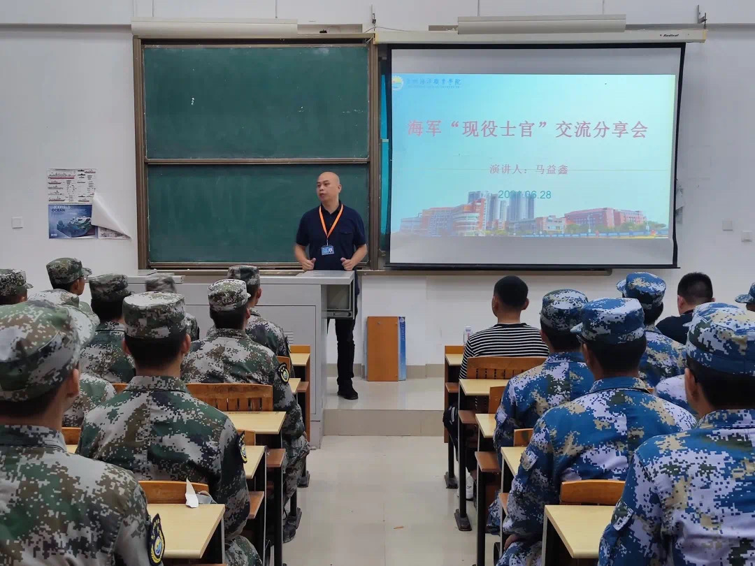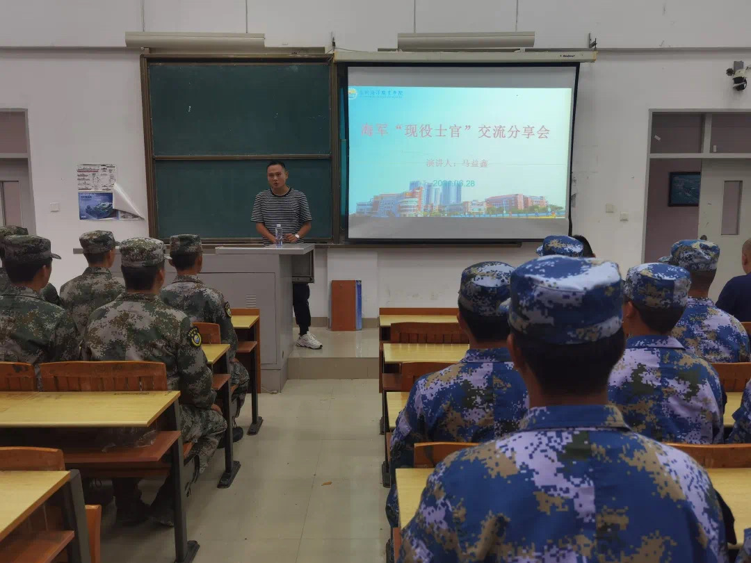 交流分享会由李艺鹏书记主持,他对马益鑫同志的到来表示诚挚的欢迎,并介绍了马益鑫同志的基本情况:马益鑫是我校16届优秀毕业生,毕业后以自身优异成绩和良好的日常表现以及良好的身体素质被海军直招士官,现为海军某舰艇部队“二期士官”,机电班长,在部队期间工作积极,表现优秀,多次受嘉奖。