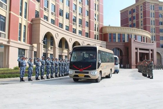 欢送仪式现场,新兵们身着戎装、胸佩红花、肩披绶带,斗志昂扬、走上校车,准备开启崭新的军旅生涯;国防后备班学子们身着迷彩服,在图书馆楼前,集体列队、欢送新兵。