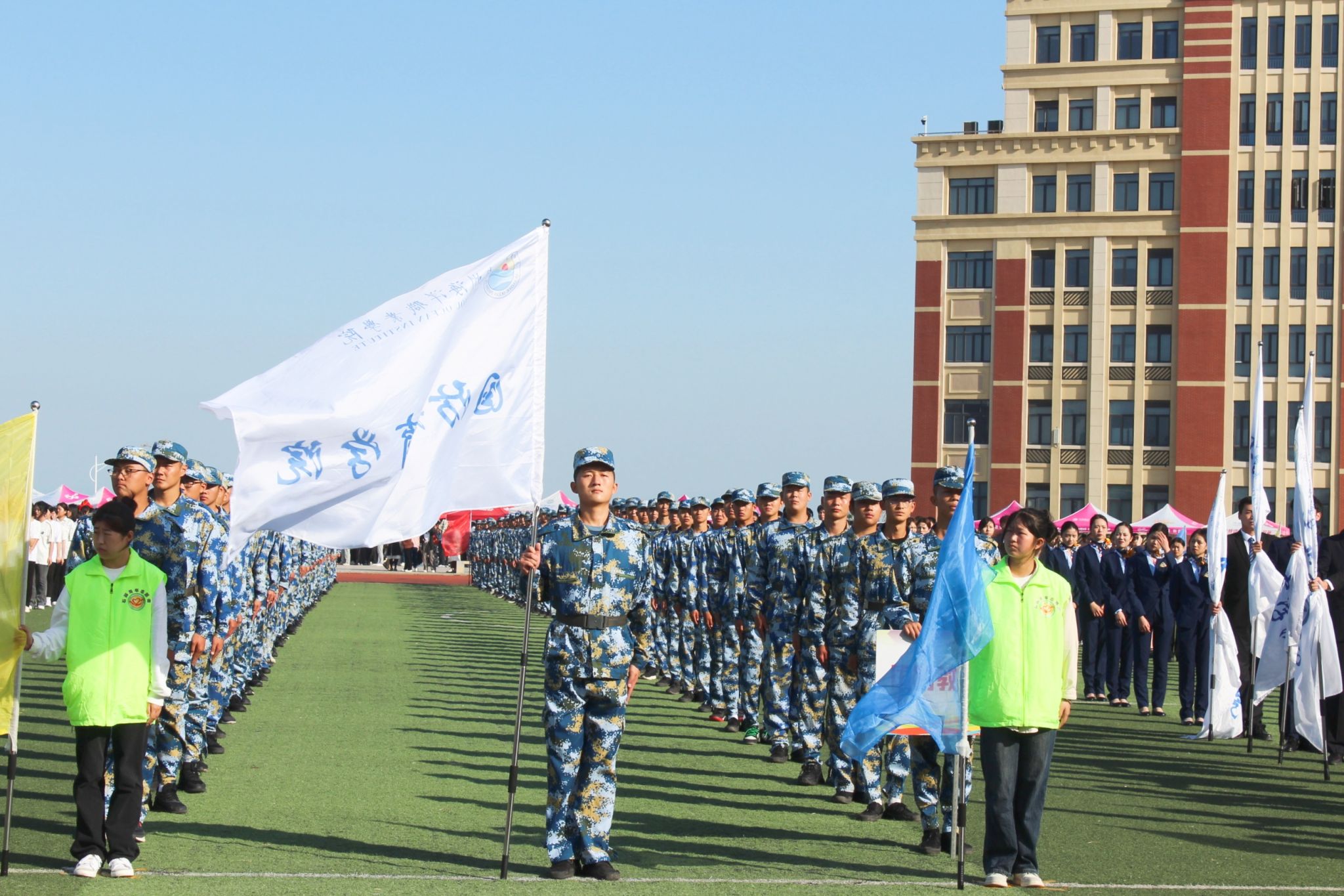 迎面走来的是国防教育学院的同学们。他们是一个团结向上、奋进拼搏的集体,整齐的步伐踏响他们的坚定,"泉海国防 展翅翱翔 磨炼意志 奋发图强”嘹亮的口号彰显他们的实力。
