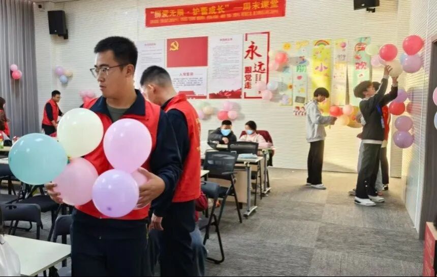 分享会圆满结束后,全体同学与志愿者携手投入到会场装饰布置工作中。大家分工明确、协作有序,有的负责充气扎绑气球,有的专注张贴主题装饰,有的细心规整摆放纪念礼品,齐心协力将活动现场装点得温馨雅致且满含仪式氛围。在这一过程中,中小学生们不仅切实体会到团队协作的独特乐趣,更有效增强了集体归属感与活动参与感,进一步凝聚了同心共进的青春合力。