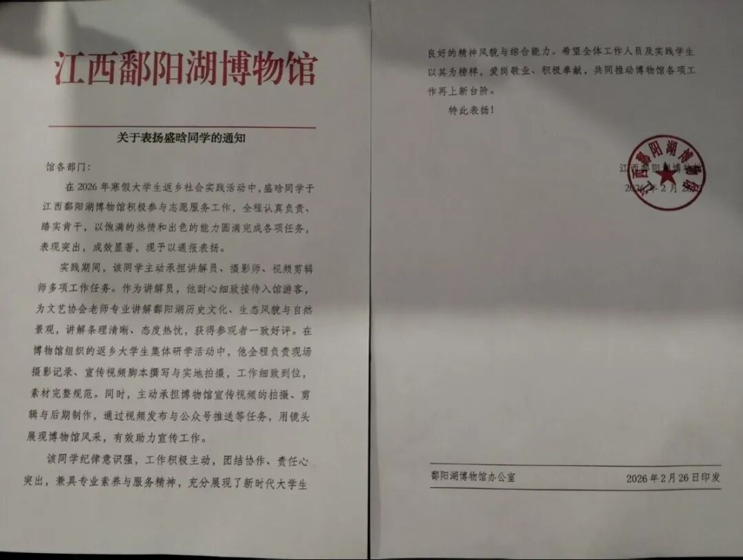 实践结束后,盛晗同学得到了江西鄱阳湖博物馆的充分肯定。他用实干与坚守展现了国防教育学院学生们志愿服务的责任与担当、践行新时代大学生的光荣使命。