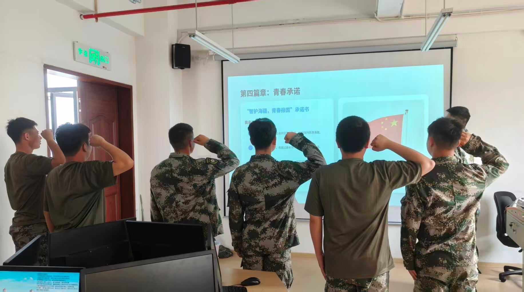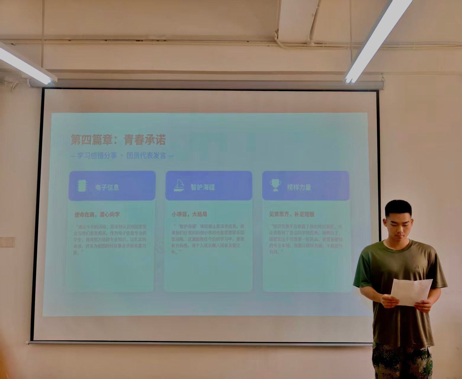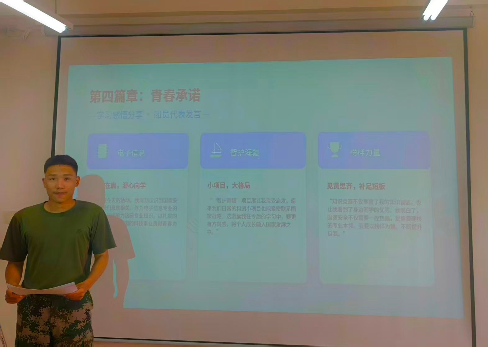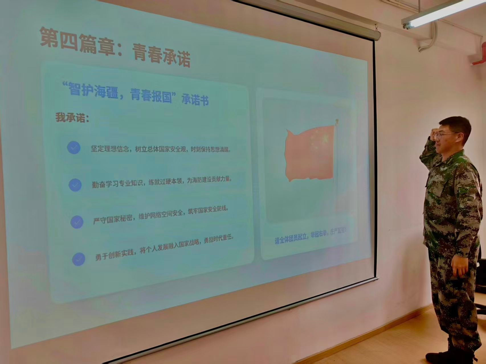 活动进入尾声,团支书带领全体团员,举起右拳,庄严宣读 ”智护海疆,青春报国” 承诺书 :坚定理想信念,树立总体国家安全观;勤奋钻研专业,练就过硬报国本领;严守国家秘密,筑牢网络安全防线;勇于创新实践,融入国家发展战略。