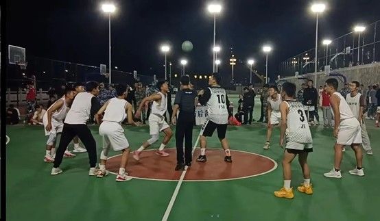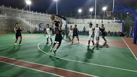 随着裁判员一声令下,篮球动了起来,几十个参与篮球比赛的国防运动员,在新篮球场上爆出了一场火烈的赛事!当一颗颗球进入篮框,他们身后是一片片欢呼声,为他们加油鼓劲,他们挥洒拼搏的汗水下,天空中绽放的烟花似乎也在提前庆祝他们获得胜利。