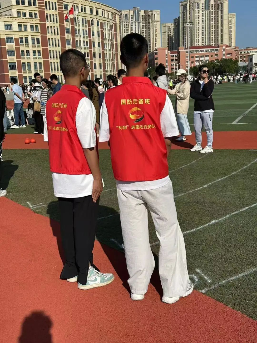 在跑道边,国防教育学院志愿者维持着现场秩序同时规整比赛环境卫生。“请注意安全”“需要时我们会帮助每一位同学”“请保持好秩序”“同学请随手将垃圾带出比赛场地”,每一个词句里,每一次耐心解答中,每一次场地规整,是志愿精神在体现,青春的价值被印在红白跑道上。