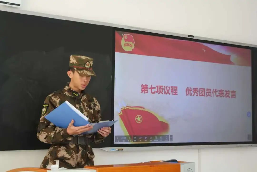 新团员周子涵同学代表发言,表达了对未来的期待和为国防事业贡献力量的决心。他的发言充满了激情和活力,激励着每一位同学勇往直前。