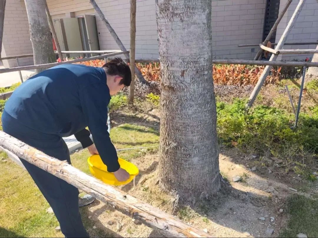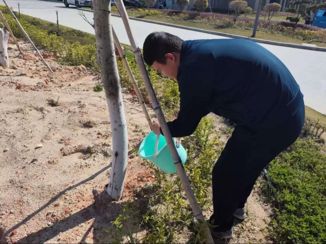 同学们手持铁锹、水桶等工具,来到了植树区域,开启了一场与春天的“绿色约会”。大家分工明确,配合默契,有的挥锹铲土,有的扶苗添坑。每一个环节都一丝不苟,在和煦的阳光下,每个同学额头满是汗珠,但脸上洋溢着喜悦与自豪。经过一番辛勤劳作,原本空旷的土地上,新栽的树苗错落有致,在微风中轻轻摇曳,展现出勃勃生机。