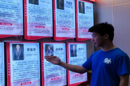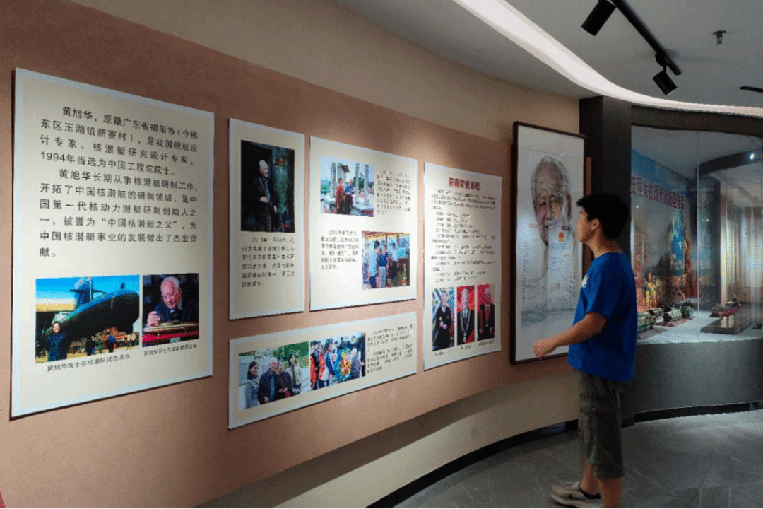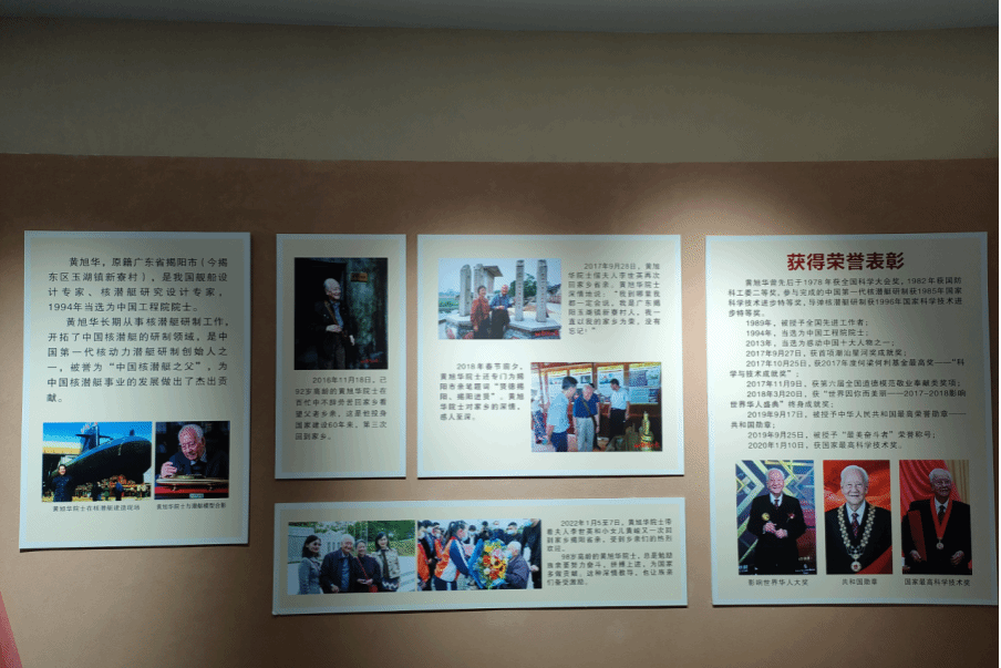 沿着专栏展线前行,展板左侧,年轻的黄旭华背上行囊告别家乡,奔赴核潜艇研制的“战场”。展板中央的照片里,2016 年92 岁的黄旭华第三次踏上故土。他抚摸着旧居的门楣,指尖划过父亲当年留下的 “耕读传家”匾额。2018 年春节前夕,他带着 “核潜艇卫士” 的勋章回乡,却将荣誉轻放在乡亲的笑声里;2022 年金秋,他在校园里,把“科技创新”的种子播进少年心田。这些归乡时刻,没有功成名就的张扬,只有 “喝榕江水长大” 的质朴回响 —— 他把对家乡的眷恋,化作反哺桑梓的行动:设立教育基金、指导青少年科研,就像核潜艇守护海疆般,默默守护着故土的未来。