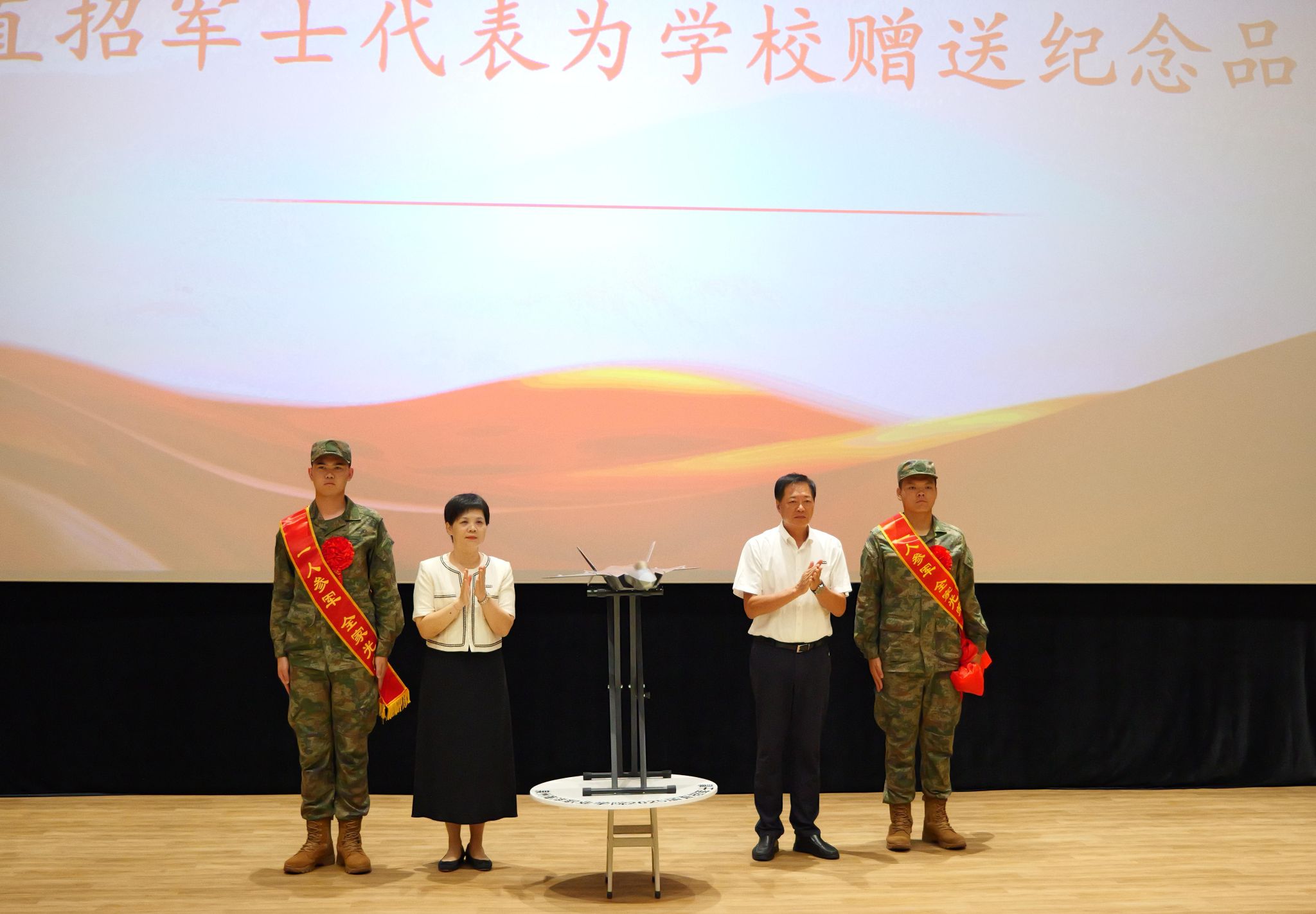 党委书记郑艳向每一位准军人赠送定制纪念品,直招军士代表也向学校回赠礼物,温馨互动凝聚深厚师生情谊。