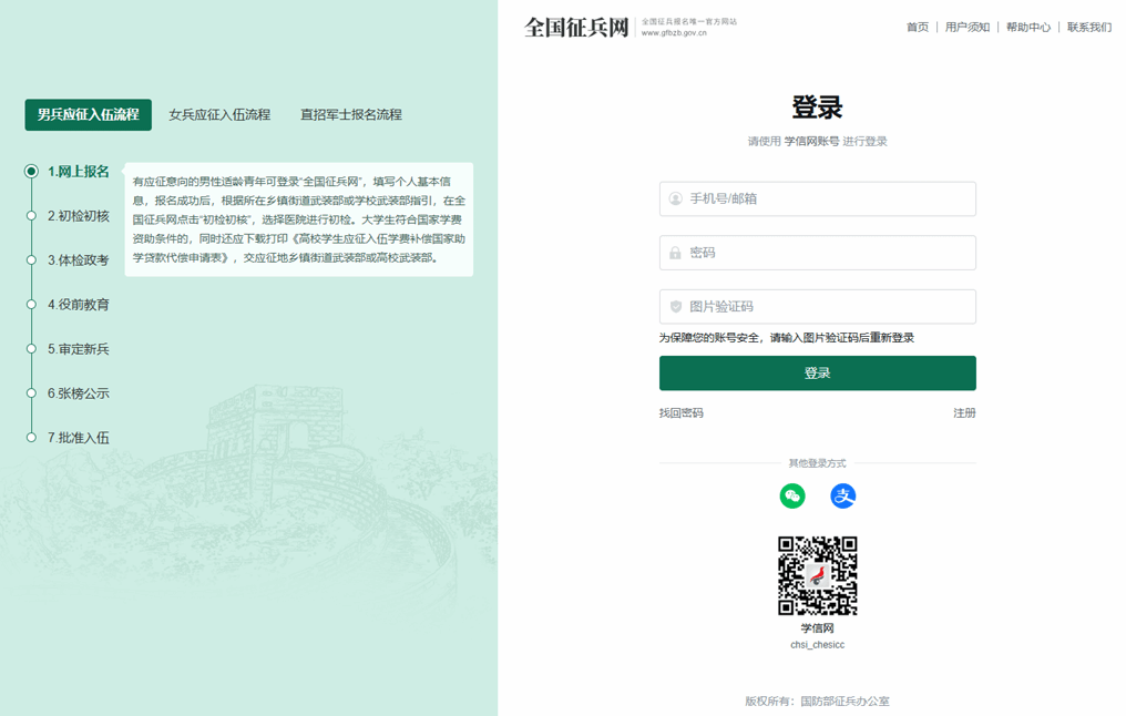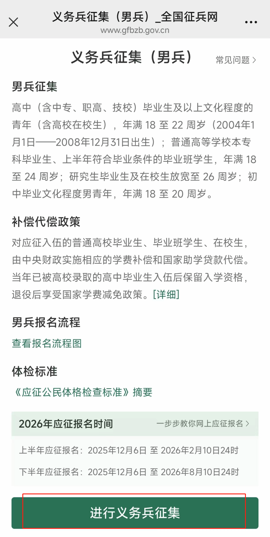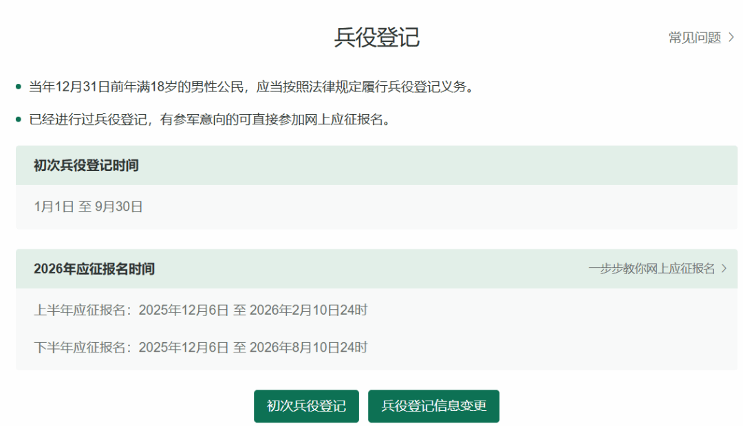 2026年全国征兵网网上登记报名于2025年12月6日开始。全国广大适龄男青年可登录全国征兵网进行兵役登记和应征报名,之后根据兵役机关安排进行实地初检初核。
