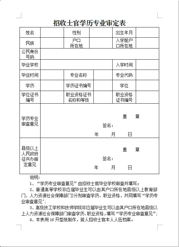 直招士官体检和政治考核合格后,兵役机关要组织填写《招收士官学历专业审定表》,填写内容如下表。