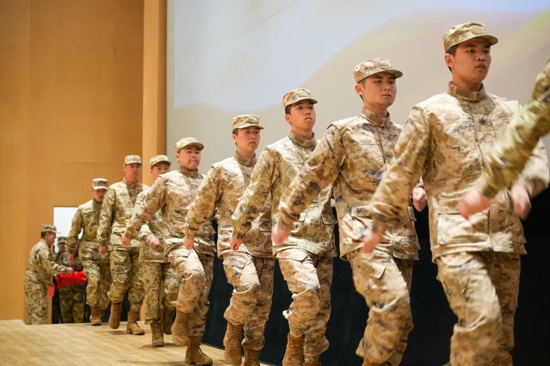 准军人代表国防教育学院袁军帅同学致感恩词,值此入伍之际,谨代表全体战友庄严承诺:将以赤子之心践行使命,严守纪律、刻苦训练,以钢铁纪律锤炼意志,以过硬本领铸就荣光。请党和人民放心,我们定当牢记 "忠诚于党、热爱人民、报效国家" 的誓言,不负韶华、不辱使命!