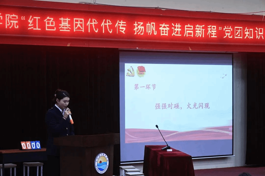 为了进一步学习贯彻党的二十大精神,引领广大师生准确把握党的二十大报告的丰富内涵、精神实质、实践要求,推动广大师生深刻领会党的二十大提出的新思想、新判断、新目标、新举措、新要求,以更加昂扬的姿态奋进新征程、建功新时代。2023年03月01日晚,由航海交通学院党支部主办,院团委、学生会承办的第三届党团知识竞赛决赛在二号教学楼2204汇报厅隆重举行。本届党团知识竞赛的主题为“红色基因代代传,扬帆奋进启新程”。