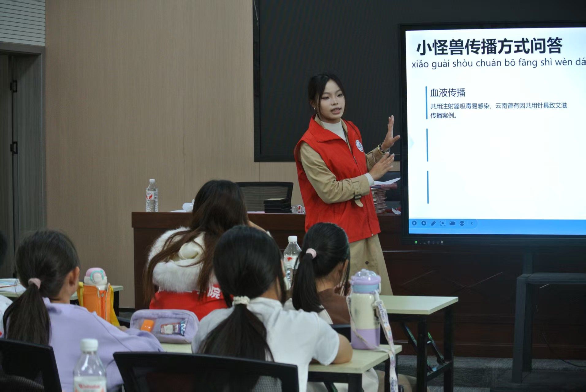 课堂上,志愿者从儿童视角出发,用形象生动的比喻讲解防艾知识——将免疫系统比作“身体小卫士”,艾滋病病毒称为“入侵小怪兽”,并以轻松易懂的语言告诉孩子们:“拉手、同桌、拥抱都不会传播病毒”,在欢笑声中化解他们对艾滋病的误解。