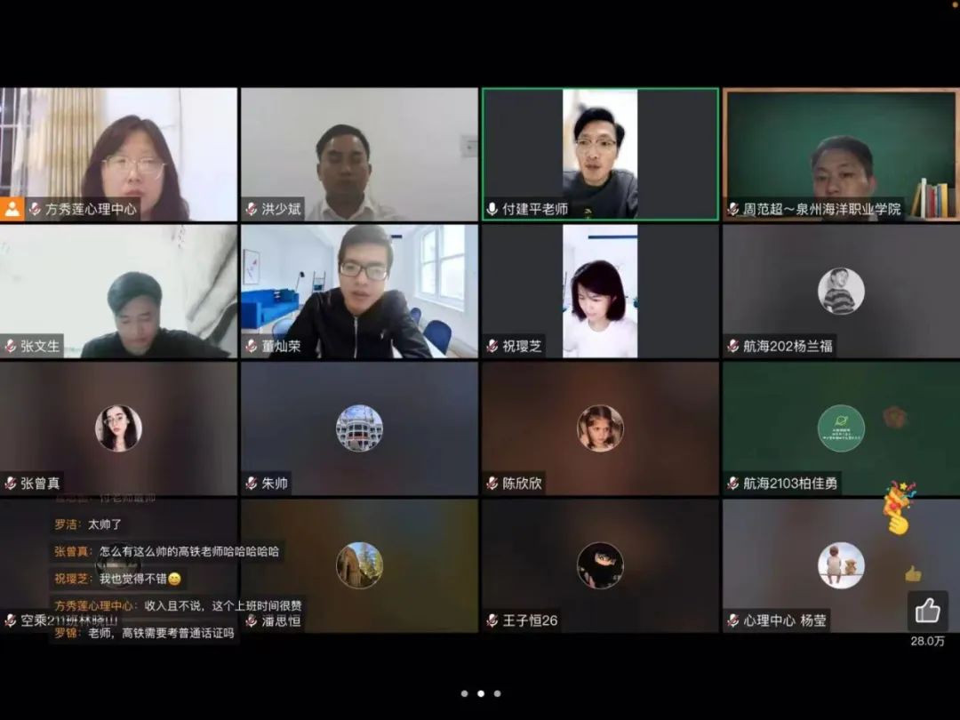 专业讲解环节中,空中乘务、航海技术、高速铁路运客服务分别由专业负责人祝璎芝老师、张文生老师、付建平老师担任讲解员。空中乘务专业负责人祝璎芝老师率先带来自己的精彩讲解,以“专业岗位发展”、“实习公司”、“面试心得”三个部分为大家做了详细的专业介绍,并提供了相当宝贵的行业分析;随后张文生老师以自身多年的航海经验为切入点,声情并茂地为大家讲解了详细的航海技术知识,学生受益匪浅;高铁专业负责人付建平老师,通过以往的教学经历和多方位的专业知识讲解,带动了全场气氛,使专业讲座到达了高潮。面对面提问环节中,各任课教师对同学们提出的问题进行了详细地解答,使同学们对专业有了更加清晰的认识,随后,副书记董灿荣向大家带来了当前疫情的最新消息,石狮已经从风险区降为防范区。他表示:“近期同学们表现不错,能积极配合辅导员的疫情防控工作,给各位同学点赞。同时,在疫情封闭期间,我建议同学们也要适当的锻炼,积极参与学校和学院举办的线上活动,丰富疫情下的日常生活。最后希望大家在封校期间过得开心,学得愉快,不信谣,不传谣,把疫情防护做到位,让我们一起共同期待泉州疫情的胜利曙光。”最后,陈东水院长对本次的活动给予了高度的评价,并对组织和参与本次精彩活动的所有师生表示感谢。他表示,希望学院所有的同学都能以本次活动为契机,在疫情防控相对空闲的时间内,以优秀的教师和学长为榜样, 思考并确立自己职业生涯规划。同时,陈院长简要分享了自己的职场成长经历,希望大家从专业技能,英语和计算机技术等工具,安全意识、责任意识、沟通意识等个人素养三个方面下功夫,为未来的就业打下坚实的基础。