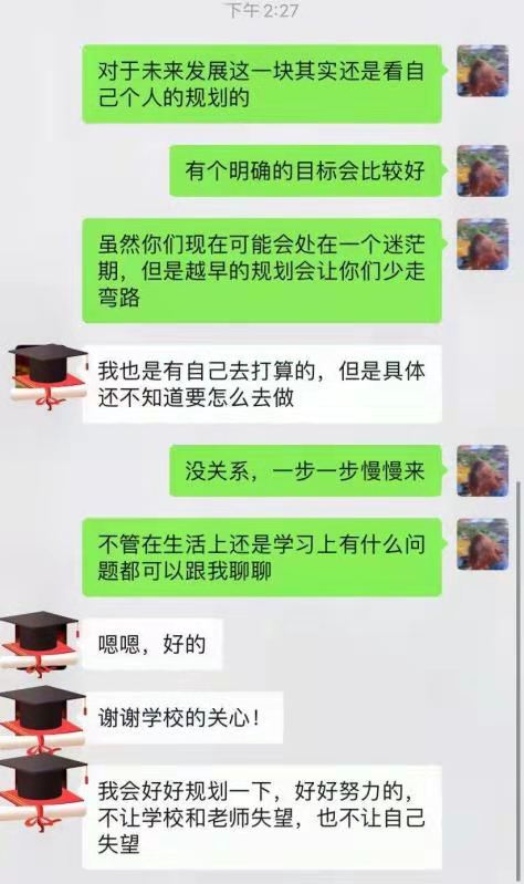 各年级辅导员本着了解学生基本情况,深入开展访谈工作,在面对学生具体实际困难中,向学生们逐一介绍现在遇到问题的解决方式方法,以及面对生活状况的心理疏导,再者介绍学校对此相关的资助、帮扶政策等。同时该学生群里的刻苦学习、努力上进的精神表示欣慰,鼓励同学们要坚定理想信念,不断用知识和实践活动充实自己,早日成为社会栋梁之才。
