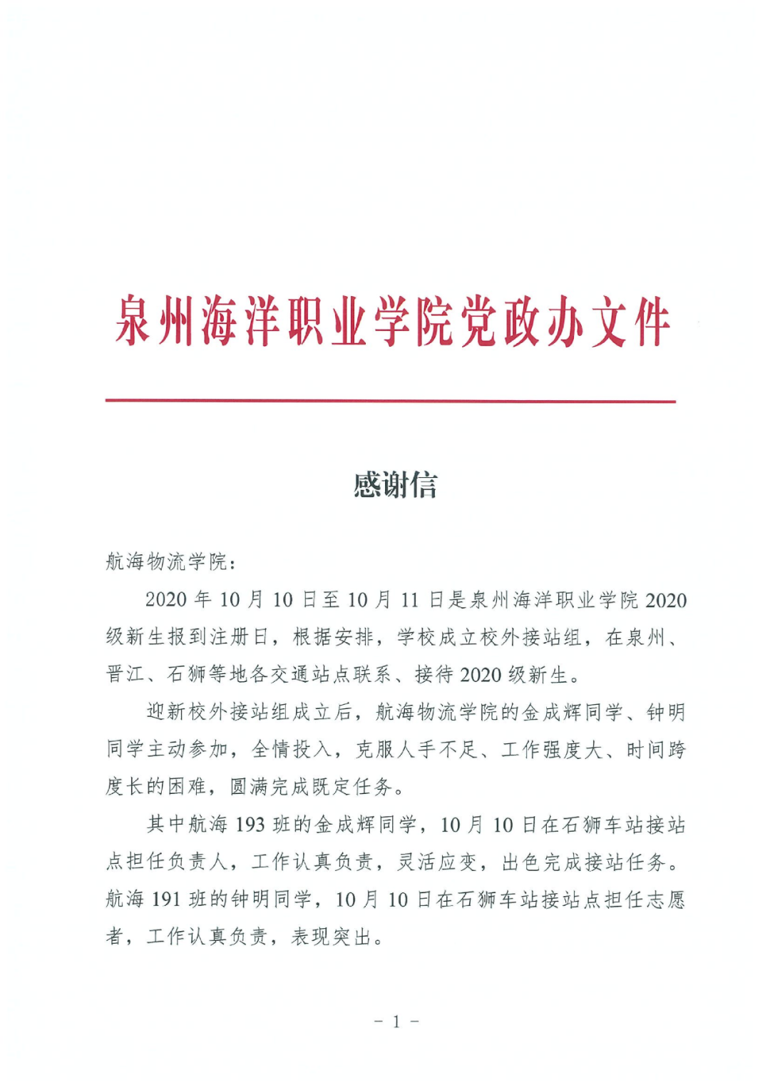 2020年10月10日至10月11日,是我校迎新生报到的日子。为了新生能顺利得到我校进行报到,在人手不足的情况下,我院航海193班金成辉、191班钟明同学主动请缨自愿担任校外接站点迎接新生。扛起了去动车站迎接新生的重任。