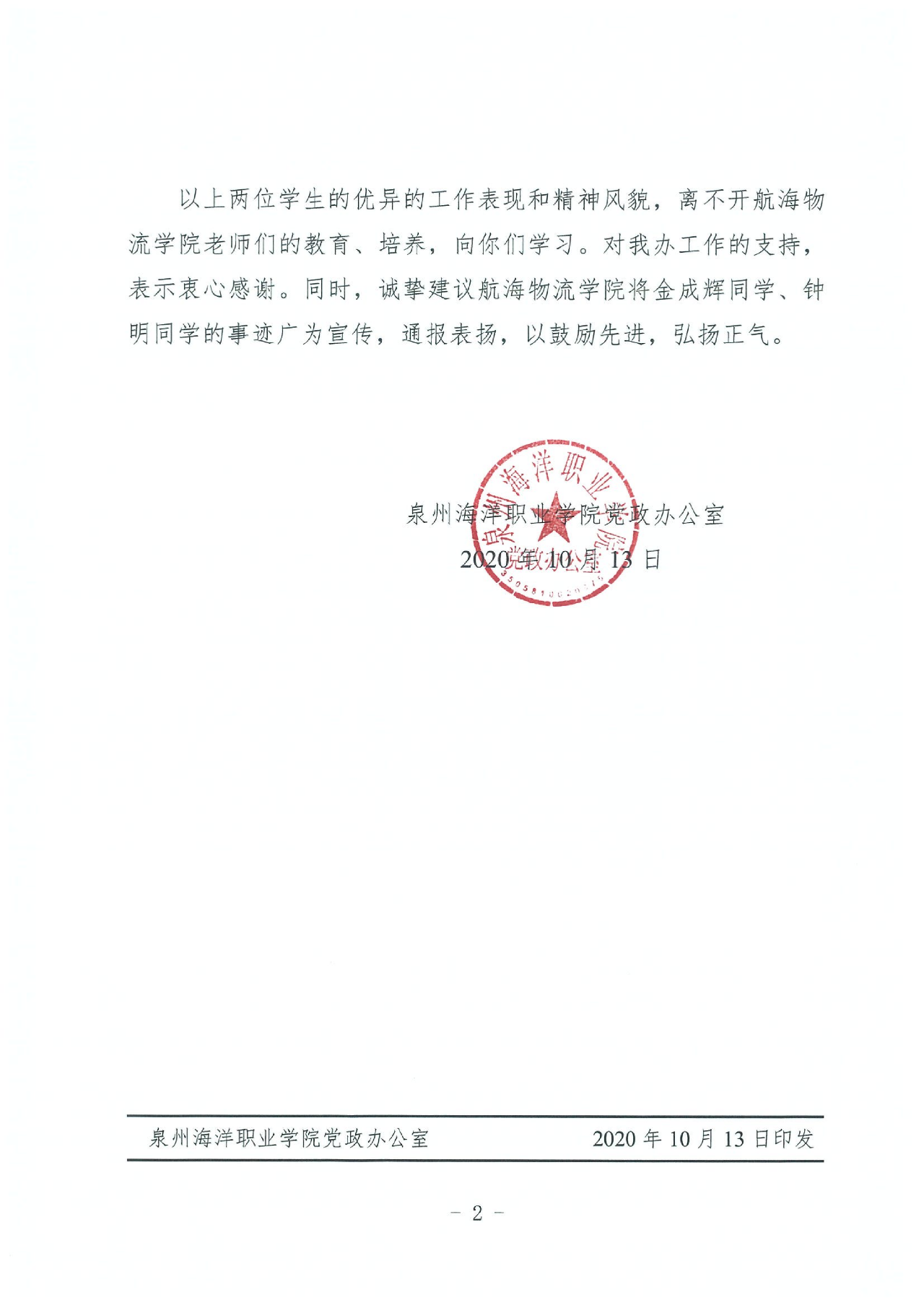 为此,我校为这两位同学提出实名表扬,并为这两位同学送出感谢信。
