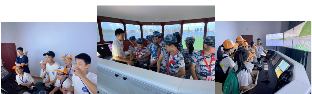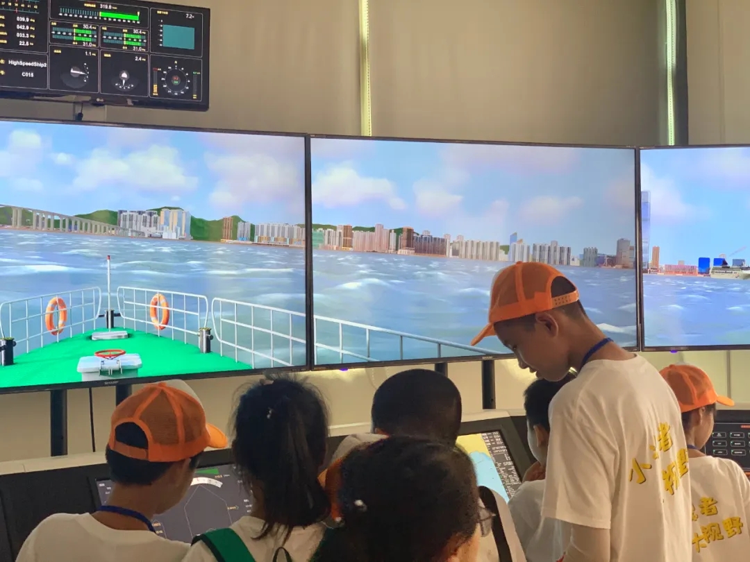 随后,讲解员带领小朋友们来到我院最新引进的360度视景航海船舶操纵模拟室,走进体验室,小朋友们便被真实远航的颠簸场景所惊叹到,为过一把“当船长,驾巨轮”的瘾,在控制台旁边,他们亲自操作,掌握方向,控制航速,体验着远航的惊险与刺激。